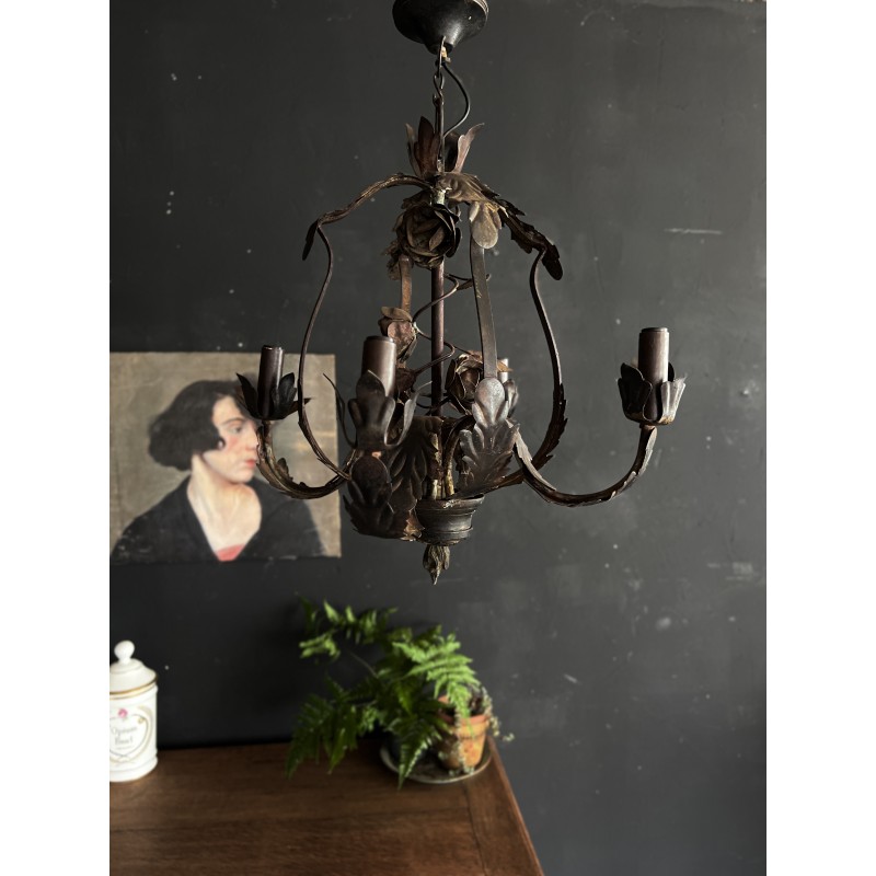 Joli lustre en tôle, avec décor de fleur. La tôle est patinée, vieillie par le temps. bon état.