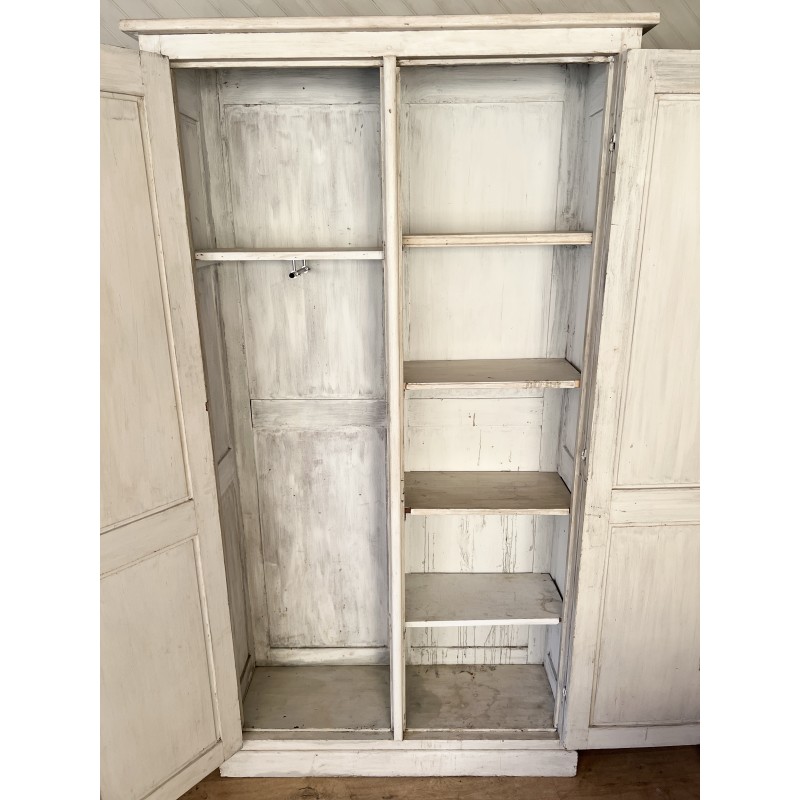 Grande armoire ancienne, qui a l’avantage d’être peu profonde, de nombreux rangements, une partie penderie et une autre avec étagères. Il y a un bouton en laiton pour ouvrir une des porte et de l’autre côté il y a une clef d’origine.