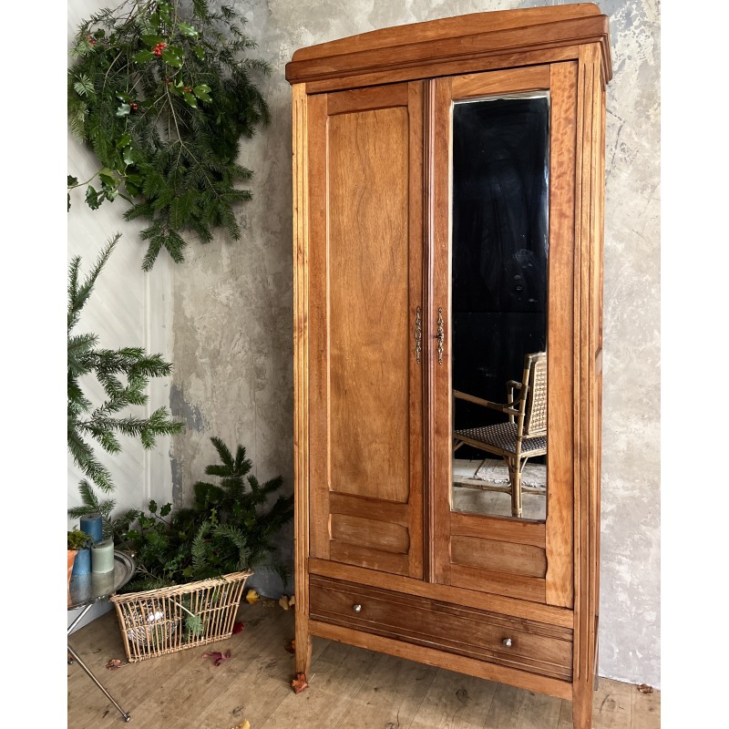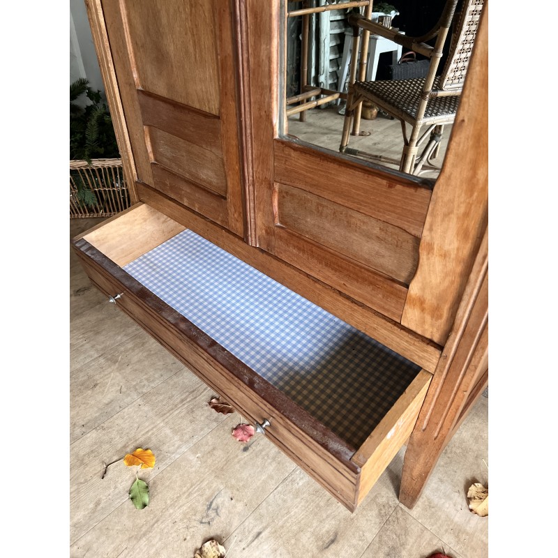 Jolie petite armoire ancienne, avec un miroir d’origine sur une des portes. À l’intérieur deux étagères avec revêtement à carreaux bleu ciel (quelques taches), il pourrait être enlevé.