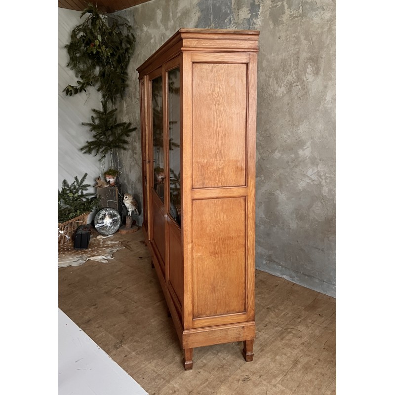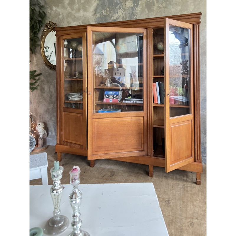 Ancienne bibliothèque en chêne. Elle a trois portes vitrées. La partie centrale est plus grande que les deux autres. Quatre étagères, hauteur réglable à l’aide de tasseaux. Présence des trois clefs. Elle est en bon état général, tache sur le côté gauche. Entièrement démontable. Envoyée démontée.