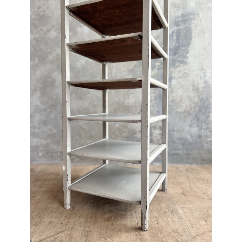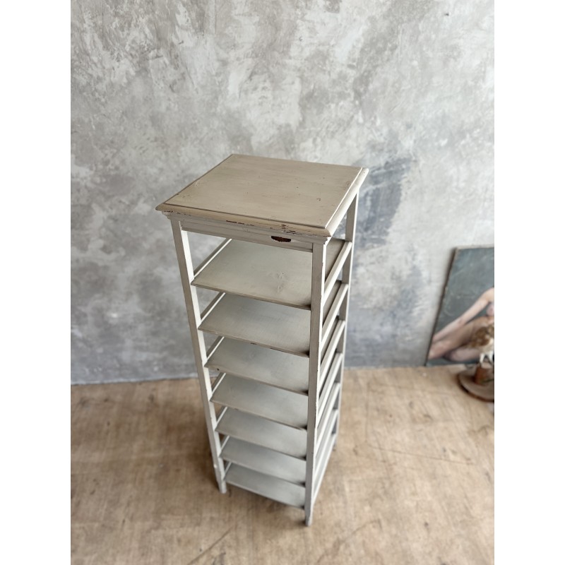 Étagère colonne, ancienne en bois peint, elle est gris clair, légèrement patiné.