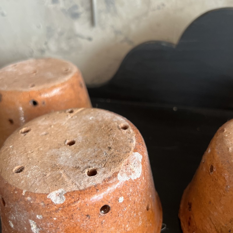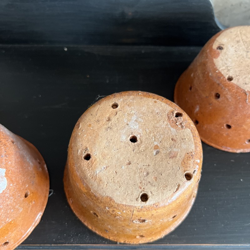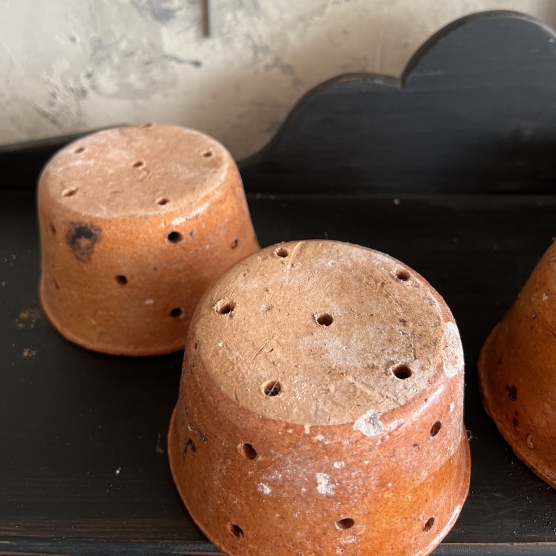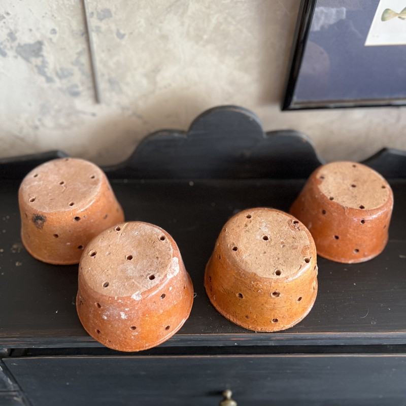 Série de 4 pots anciens en terre cuite émaillée, percés de petits trous tout autour. À l’origine utilisés comme pots à faisselle pour laisser égoutter les fromages, ils trouvent aujourd’hui mille détournements : cache-pots, rangement de cuisine, pot à crayons ou simplement objet décoratif.Leur teinte orangée, patinée par le temps, leur donne beaucoup de charme et d’authenticité.