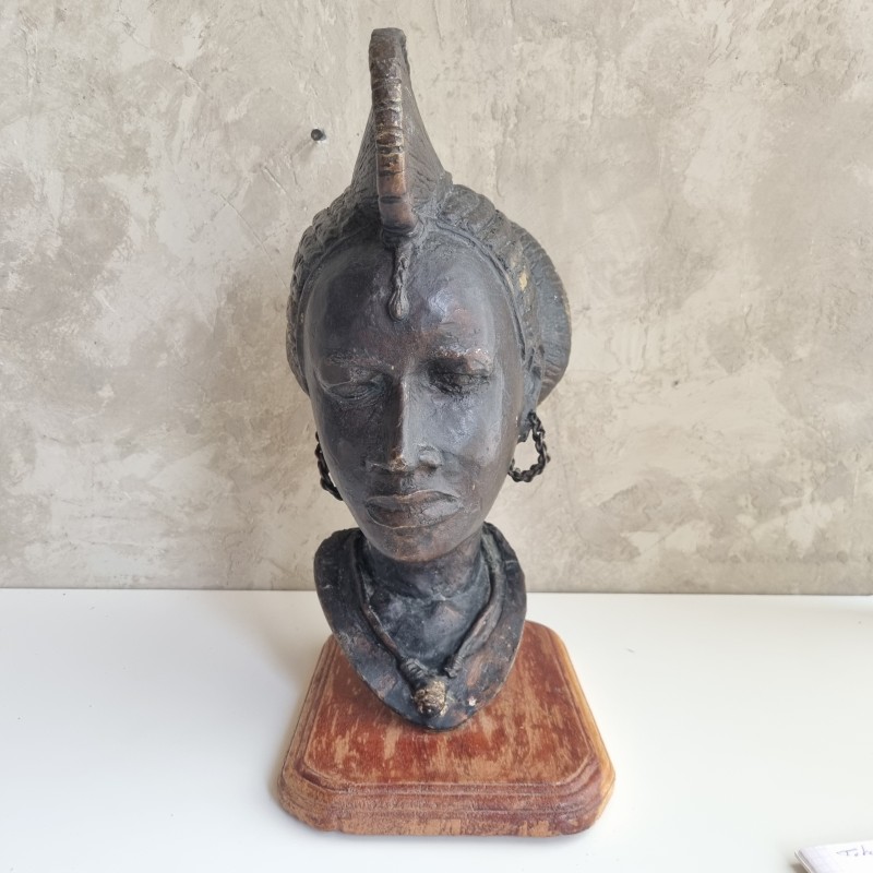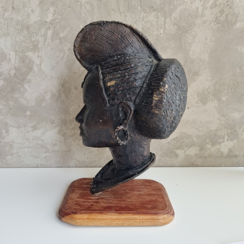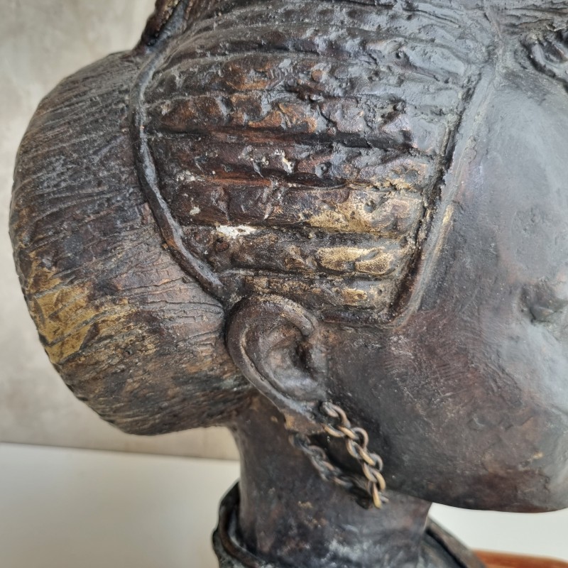Buste en bronze représentant une femme africaine, probablement de la tribu Peule au vu de la coiffe.