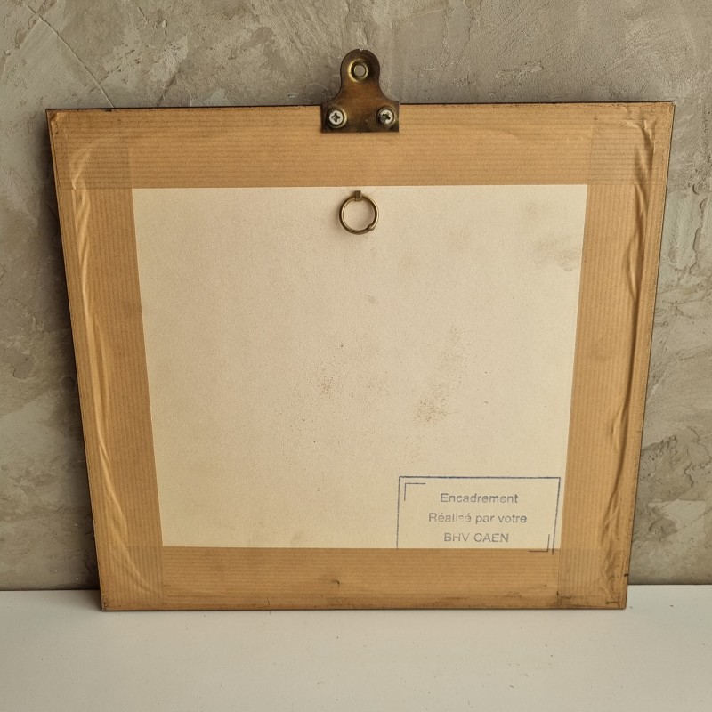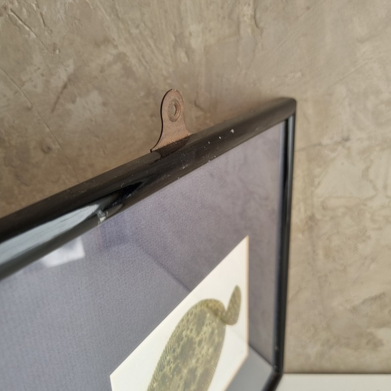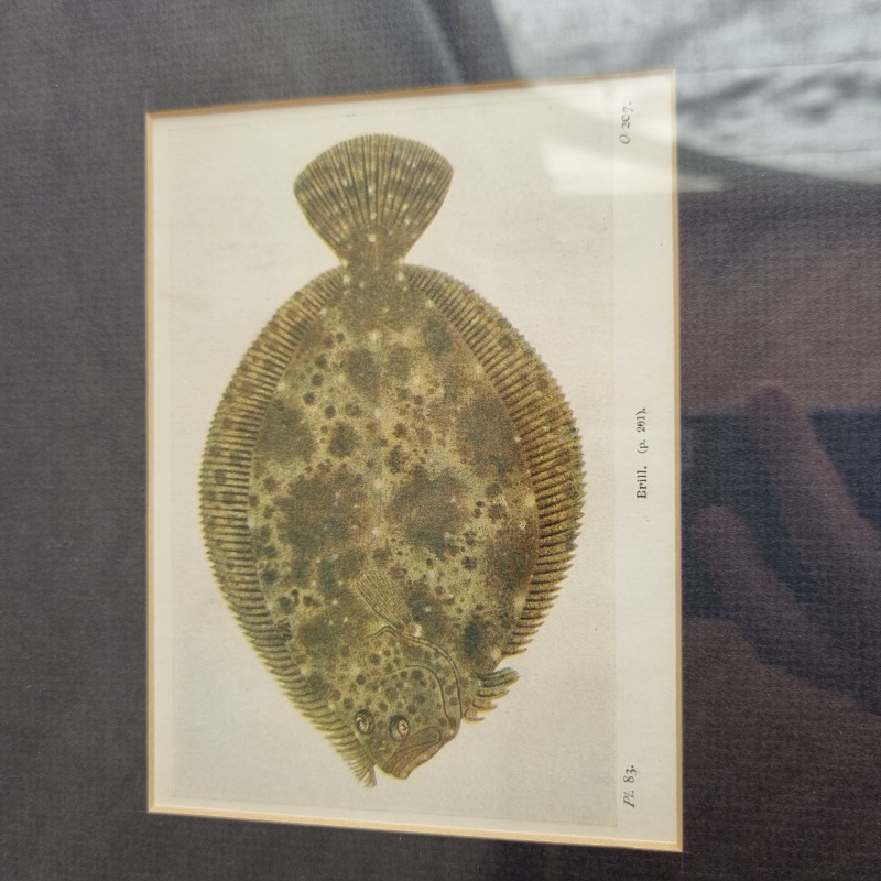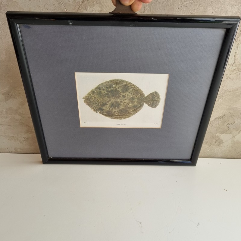 Cadre en bois laqué noir, avec un passe-partout bleu et une représentation de barbue en son centre.