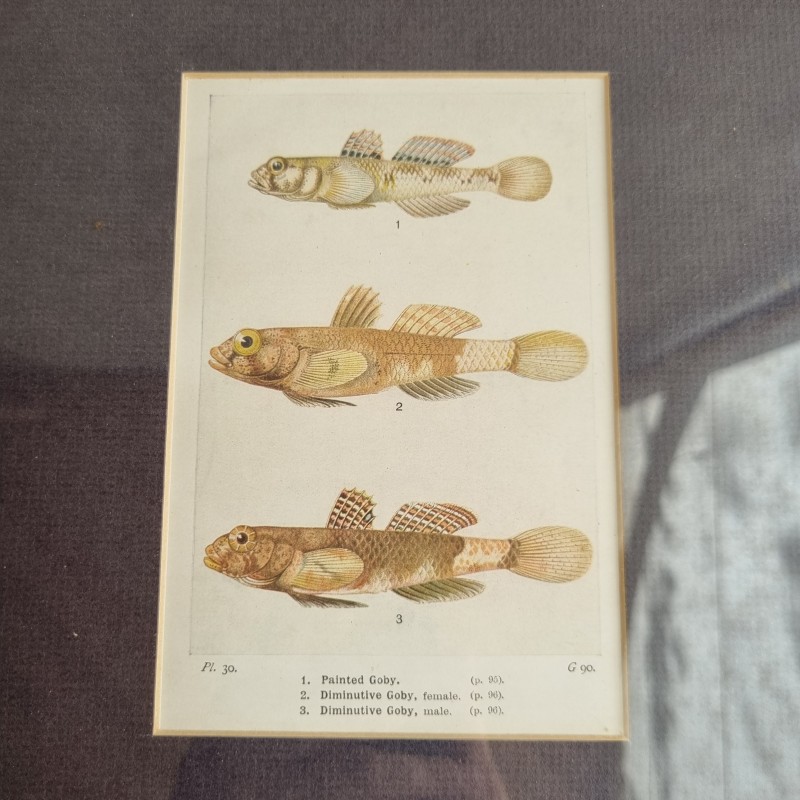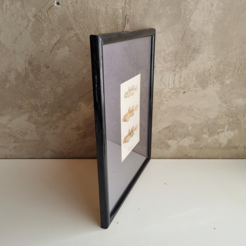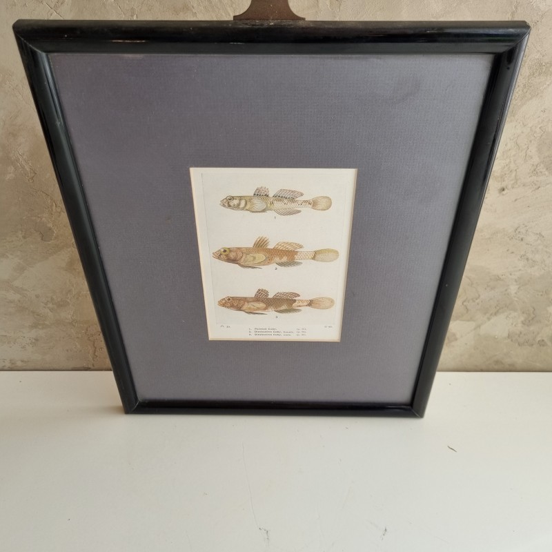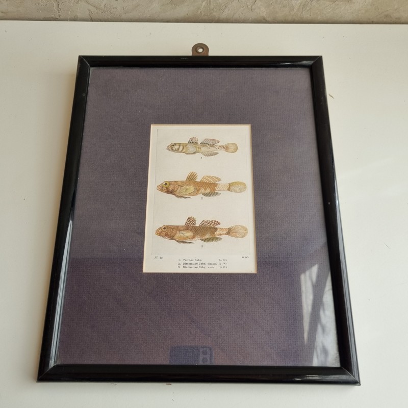 Cadre en bois laqué noir, avec un passe-partout bleu et une représentation de gobies en son centre.