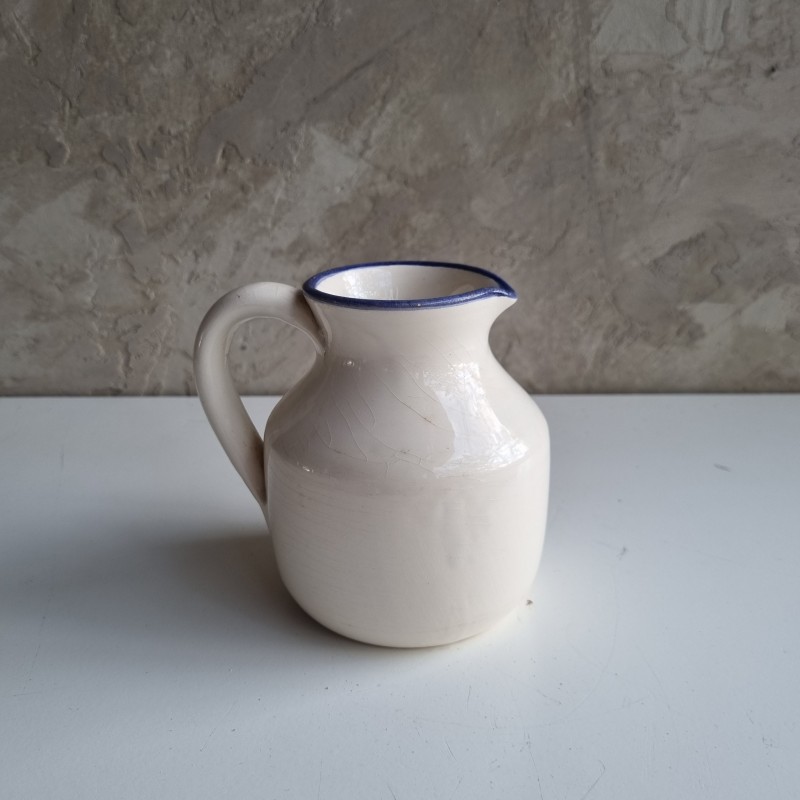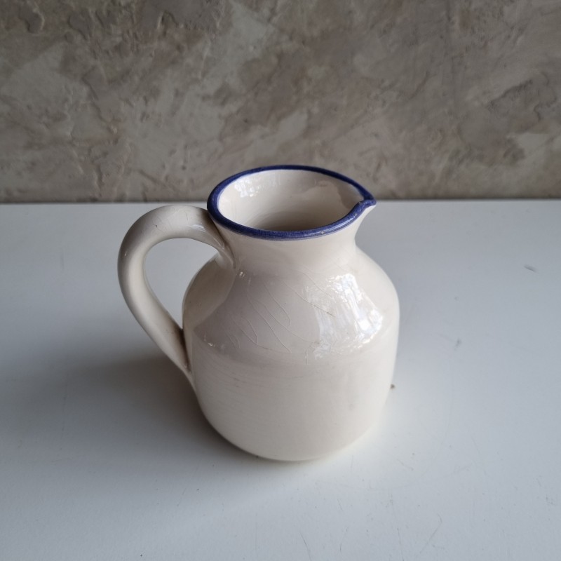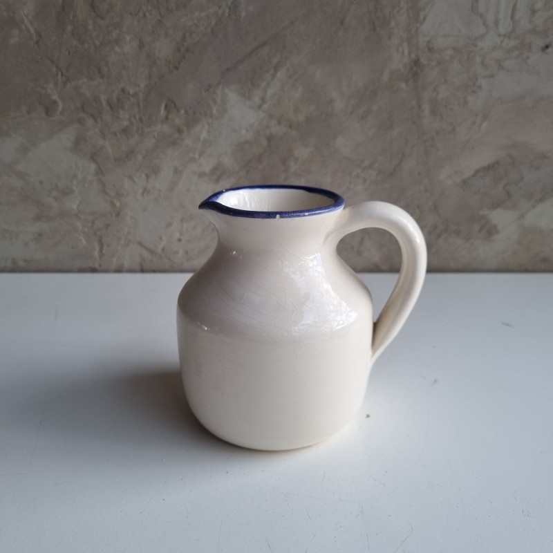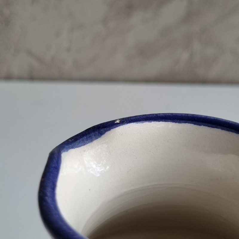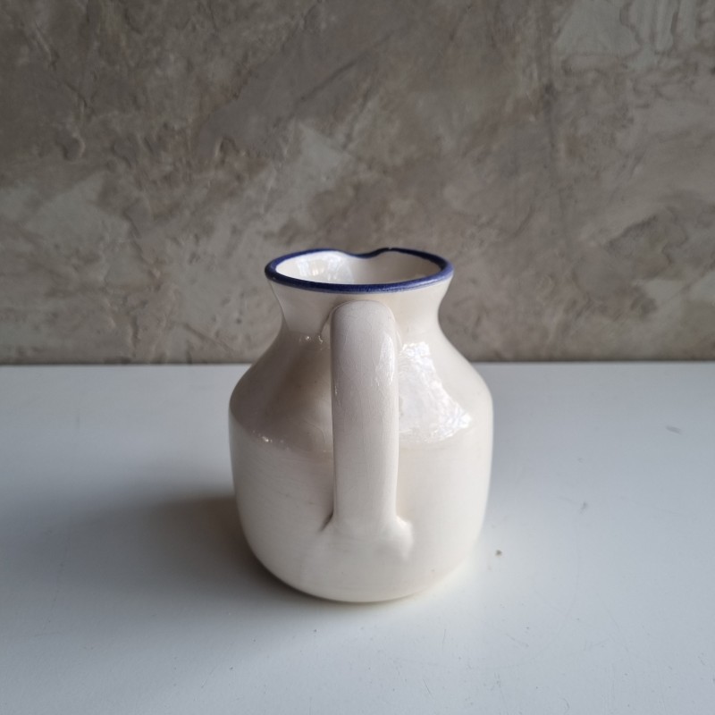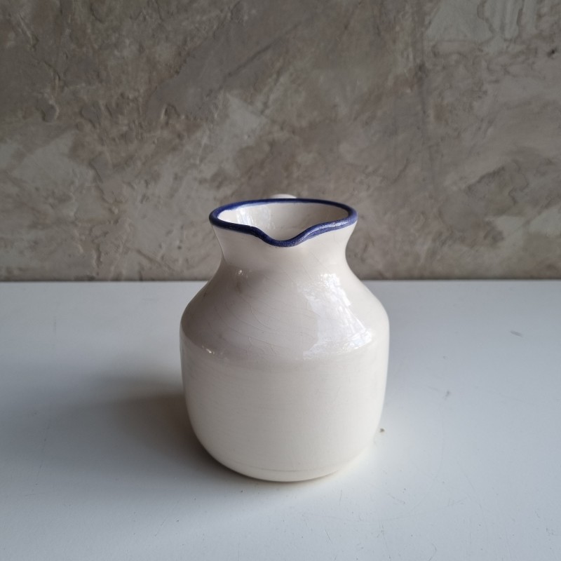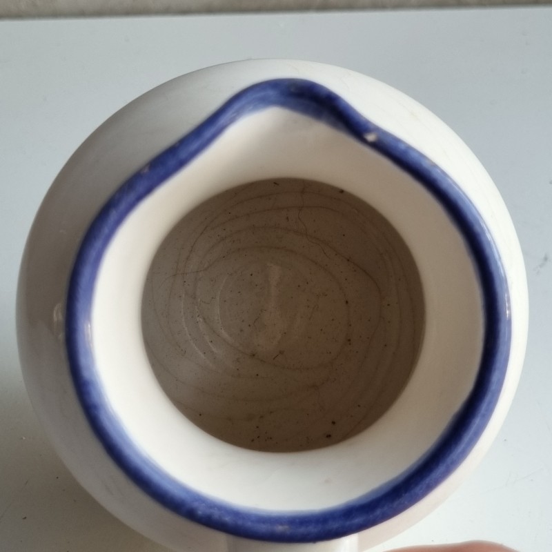 Céramique émaillée en blanc avec un liseré bleu autour du col.