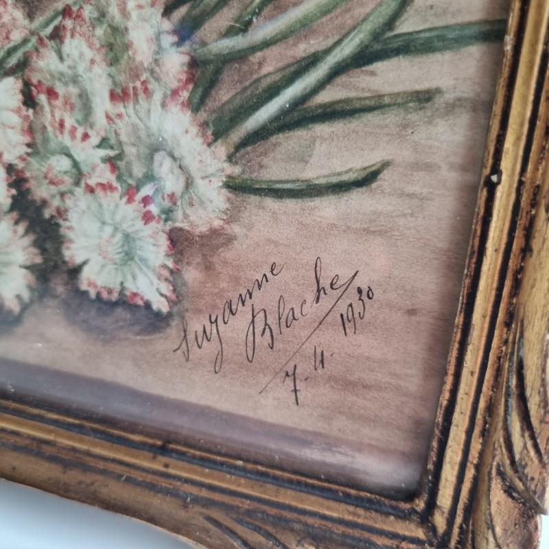Nature morte de fleurs sous verre et cadre en bois sculpté doré.