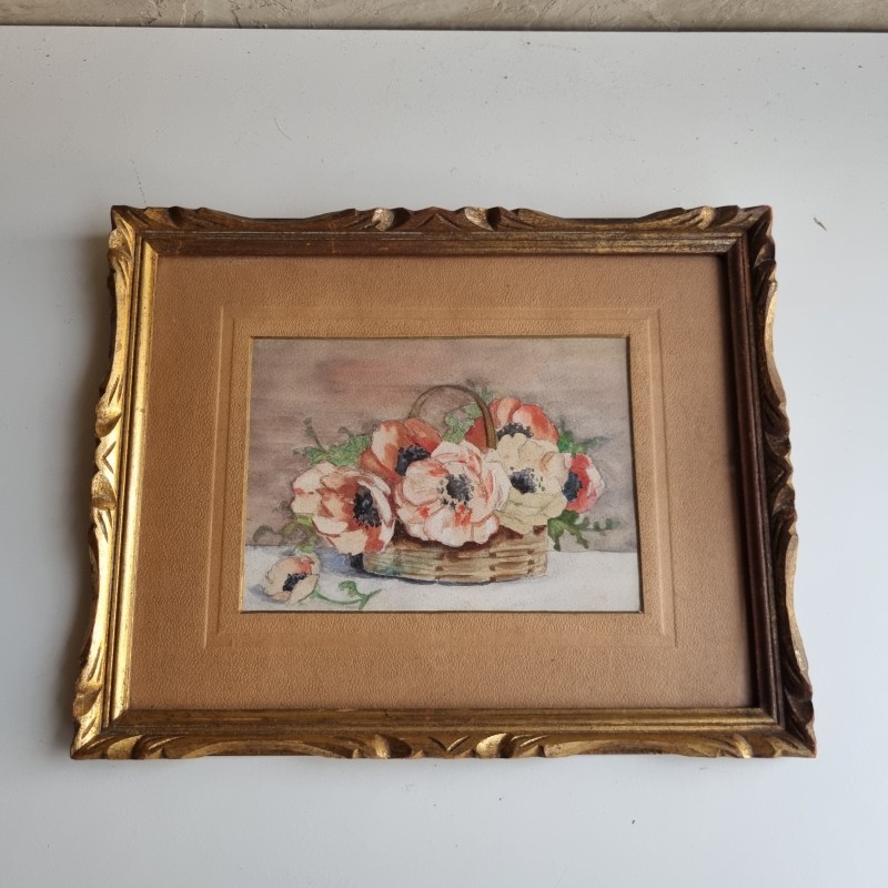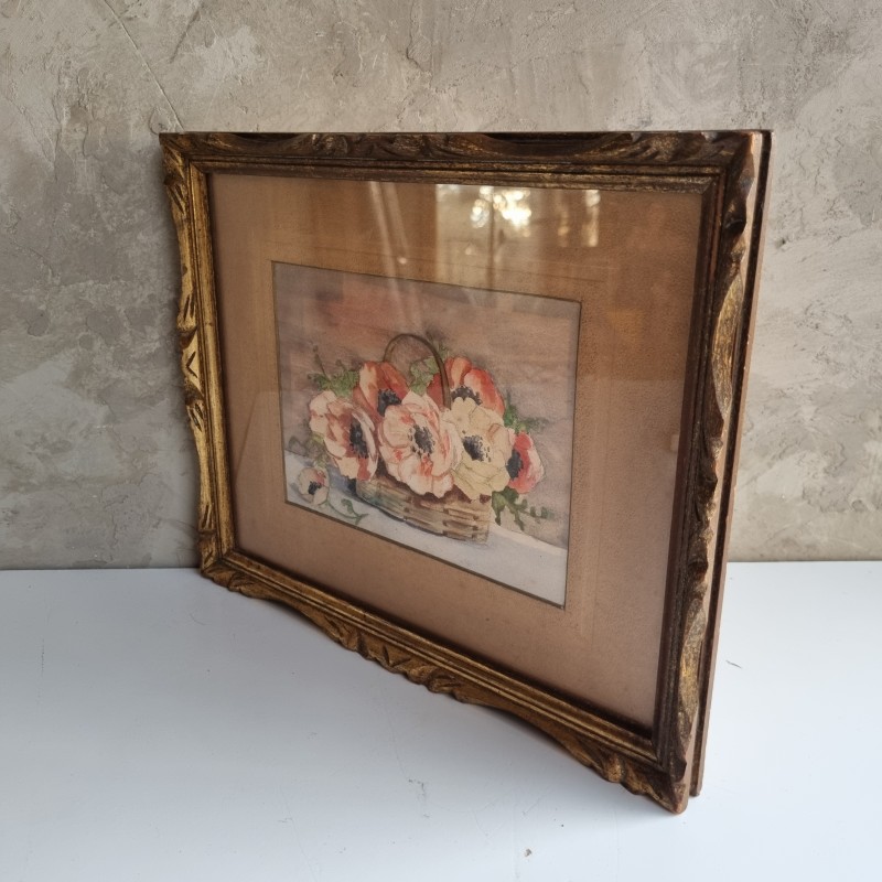 Nature morte de fleurs dans leurs panier, sous verre et cadre en bois sculpté doré.