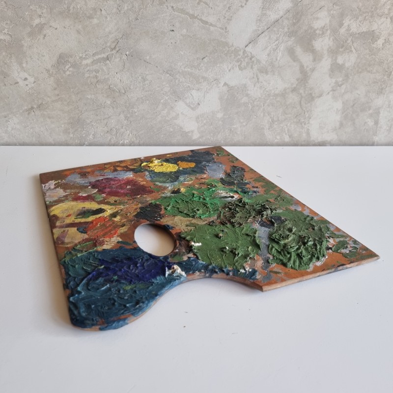 Palette de peintre en bois avec peinture en relief des deux cotés.