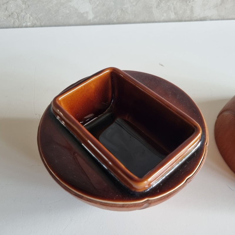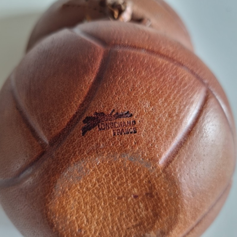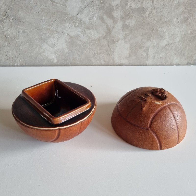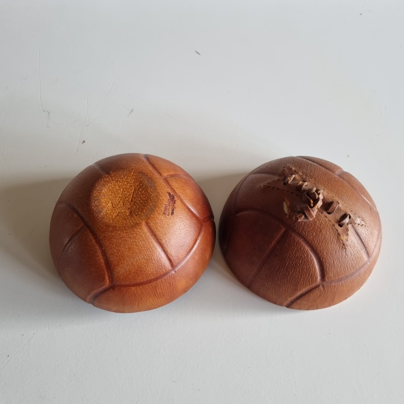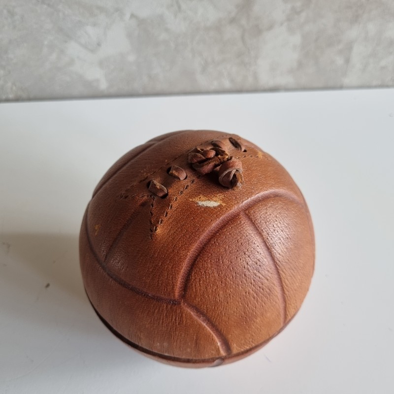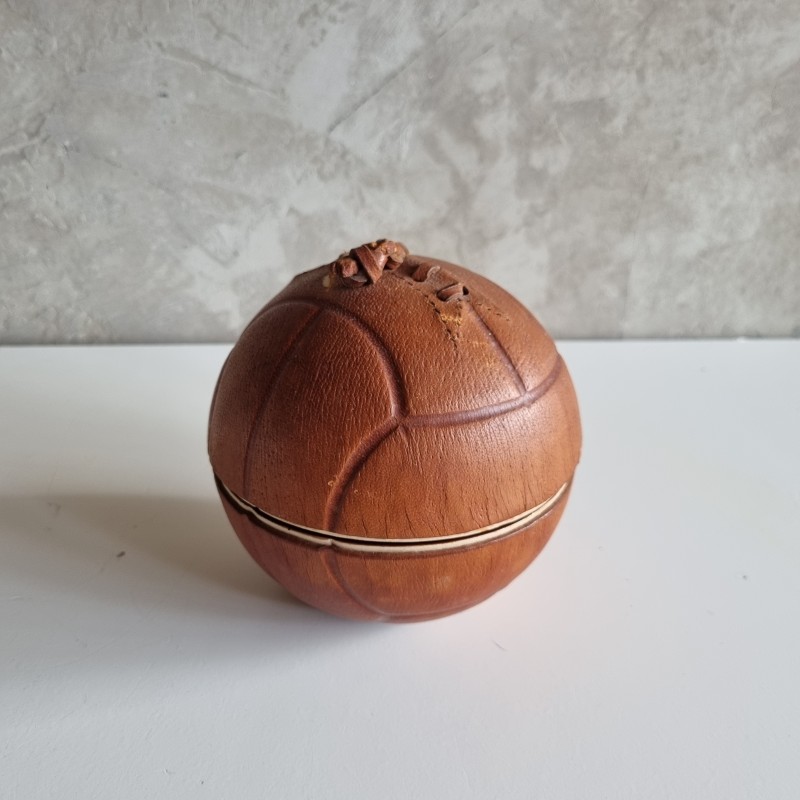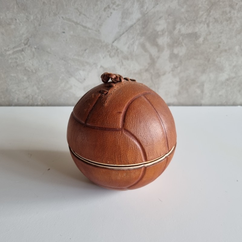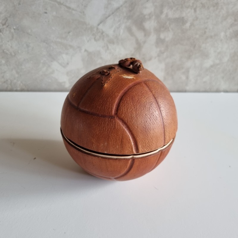 Boîte en céramique marron gainé de cuir représentant un ancien ballon de foot.