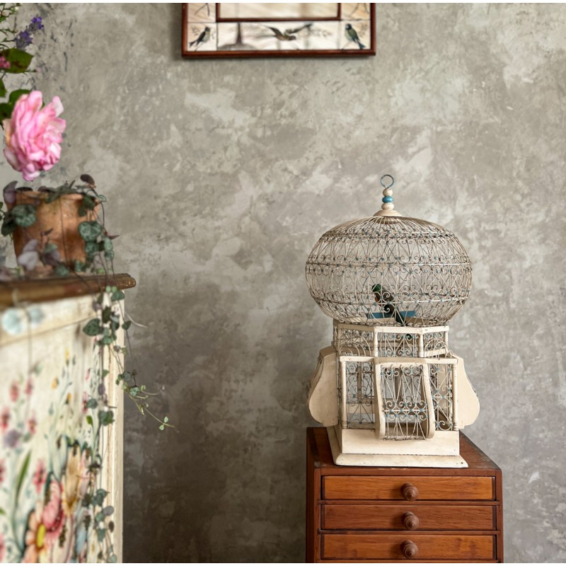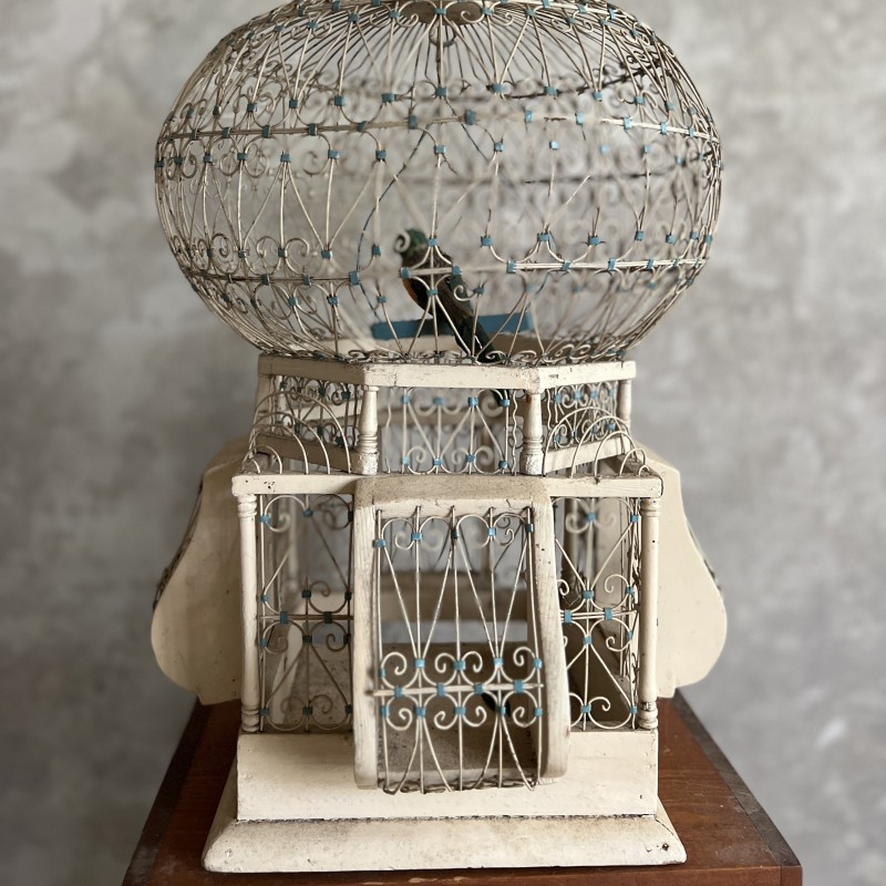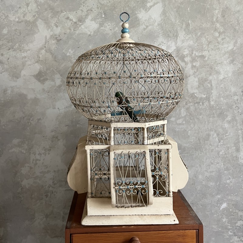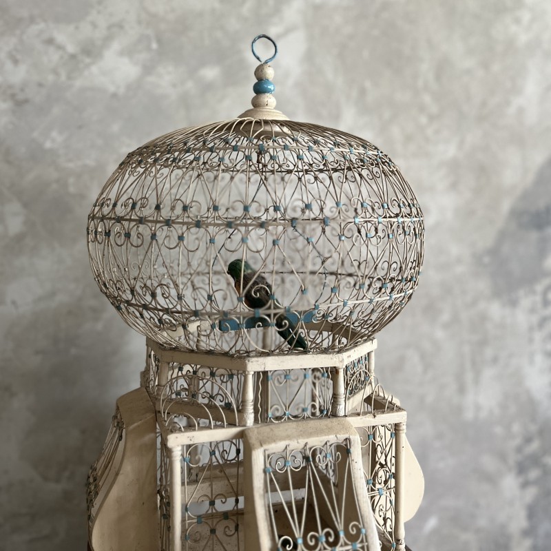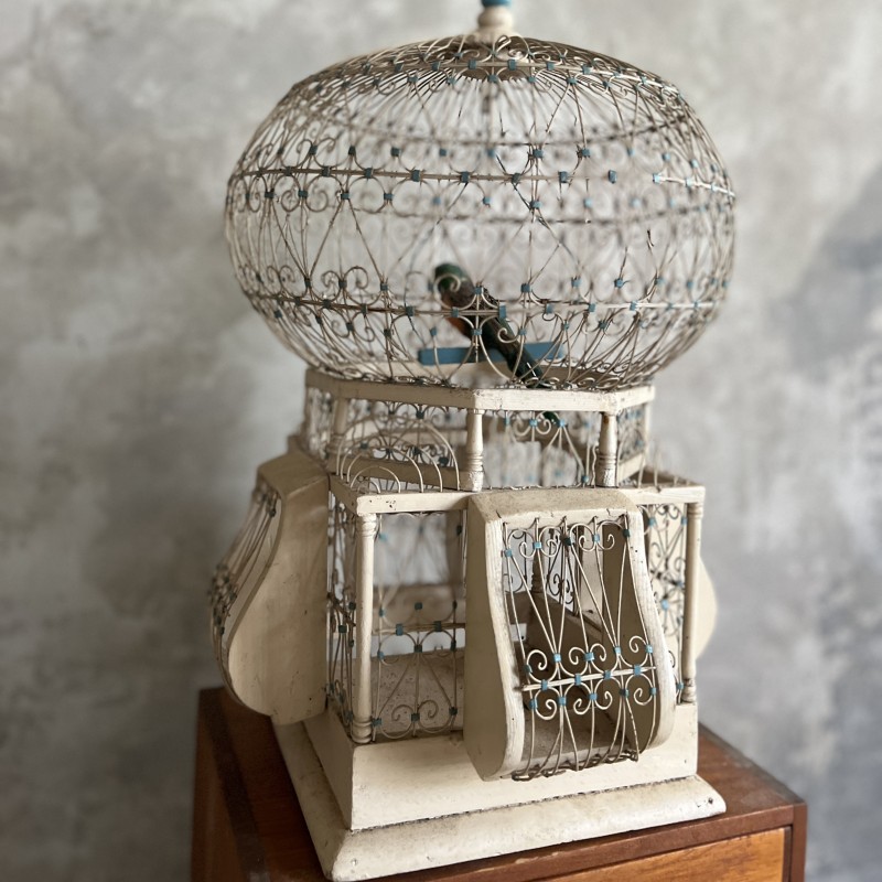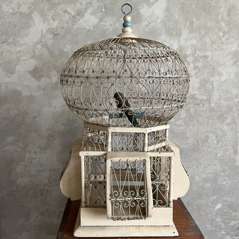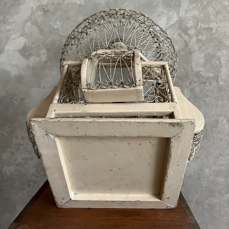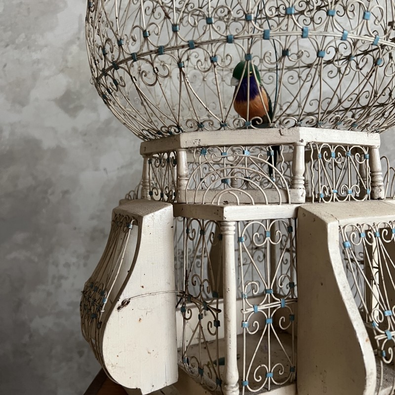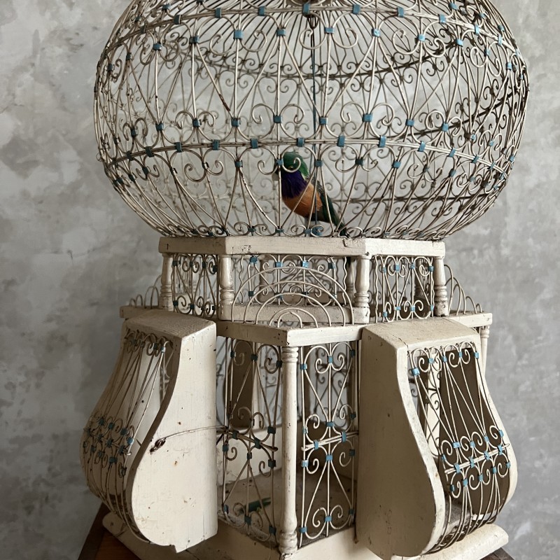 Charmante cage à oiseau ancienne en métal et bois, au travail ajouré finement ouvragé.