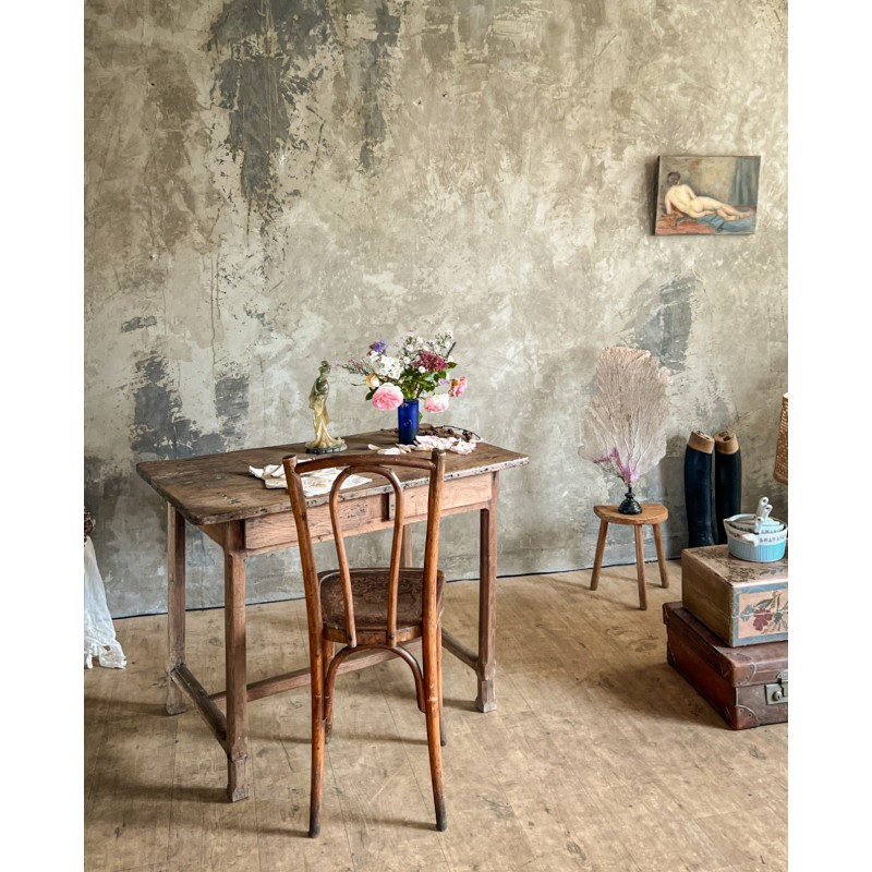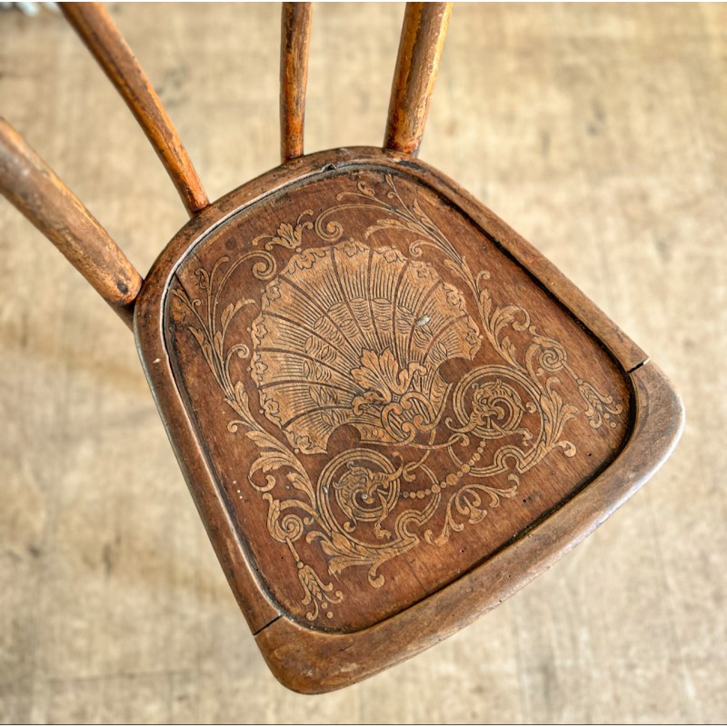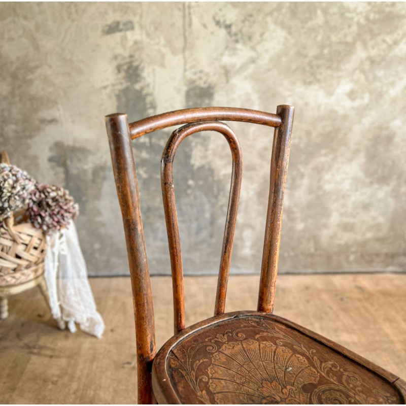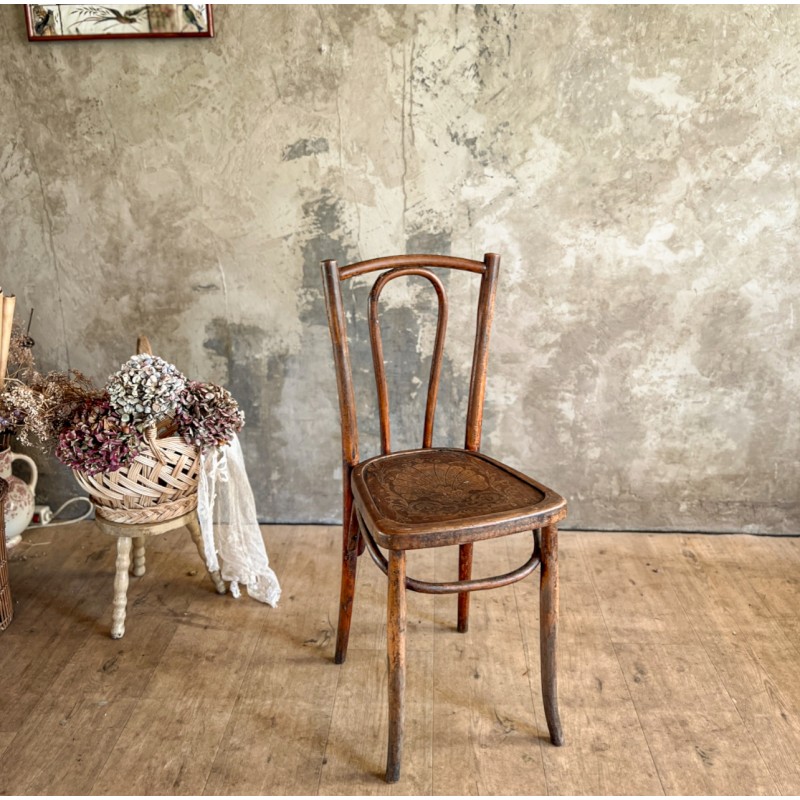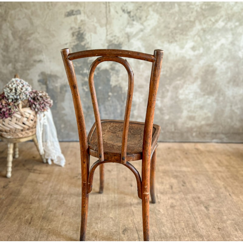 Son assise gravée d’un motif floral travaillé et sa ligne typique des chaises de café du début du XXᵉ siècle lui confèrent une allure pleine de caractère.