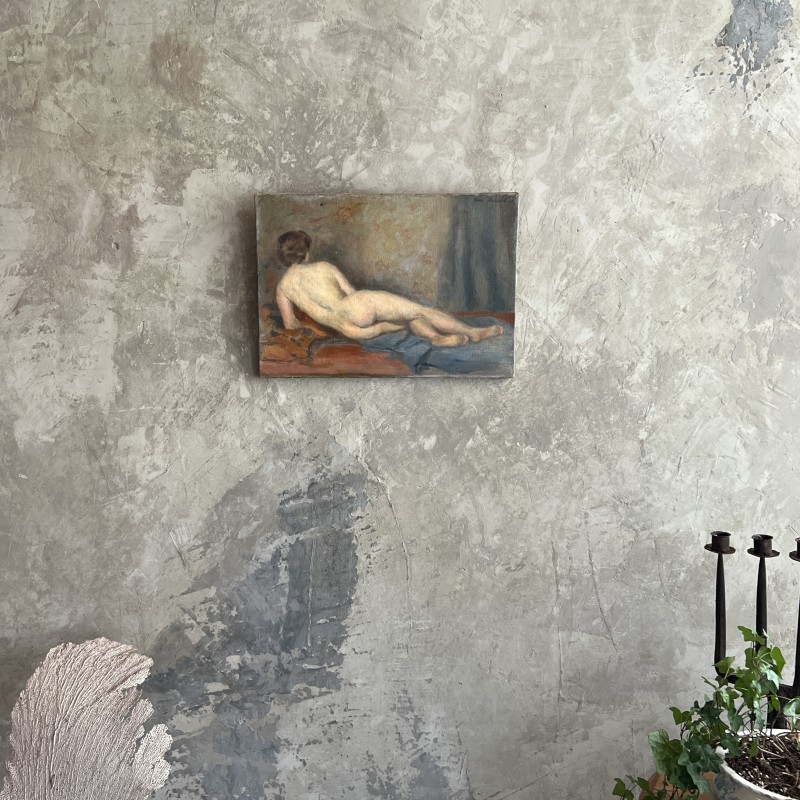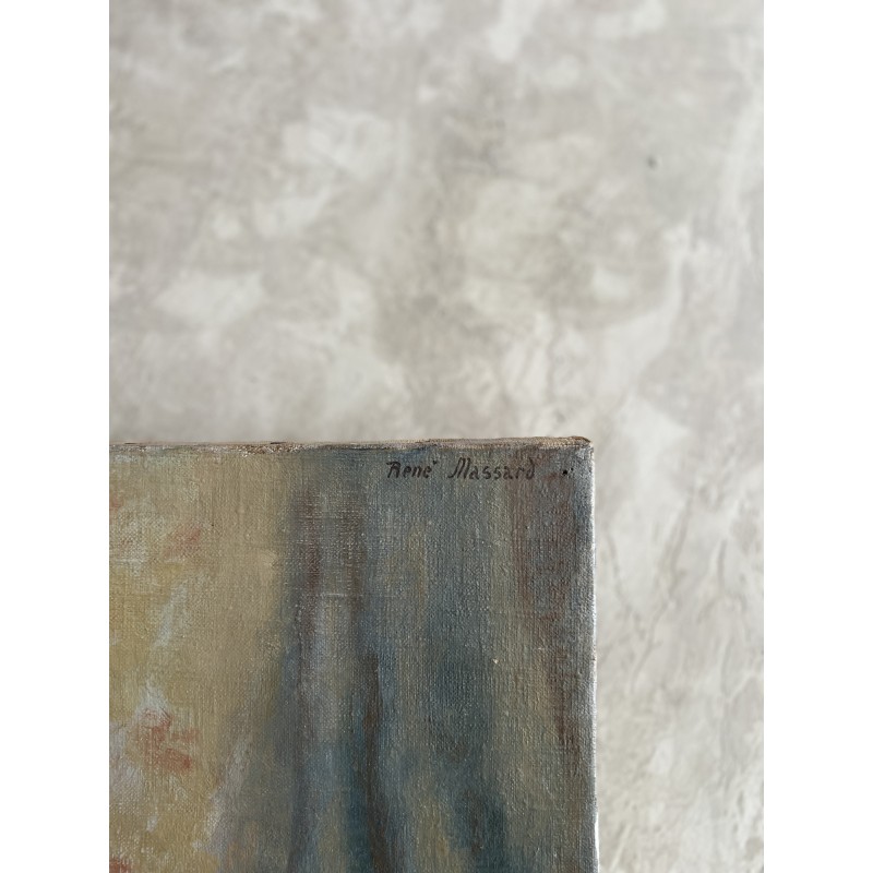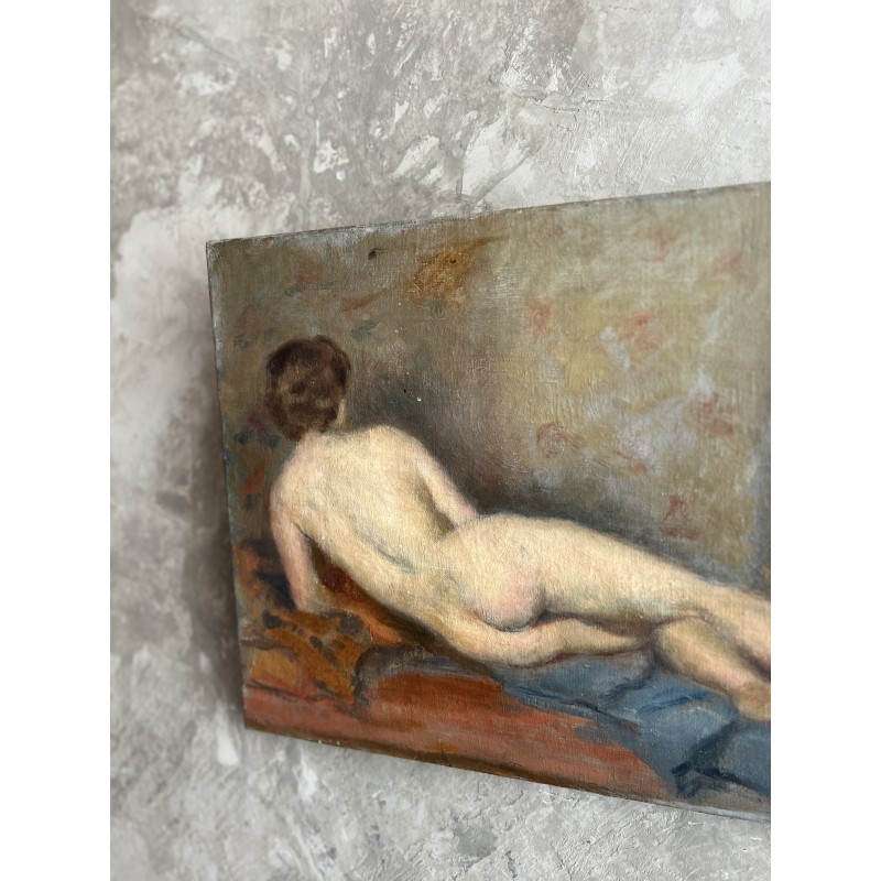 Élégante huile sur toile représentant un nu féminin allongé, signée René Massard dans le coin supérieur droit.
