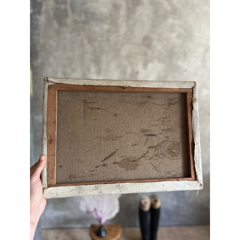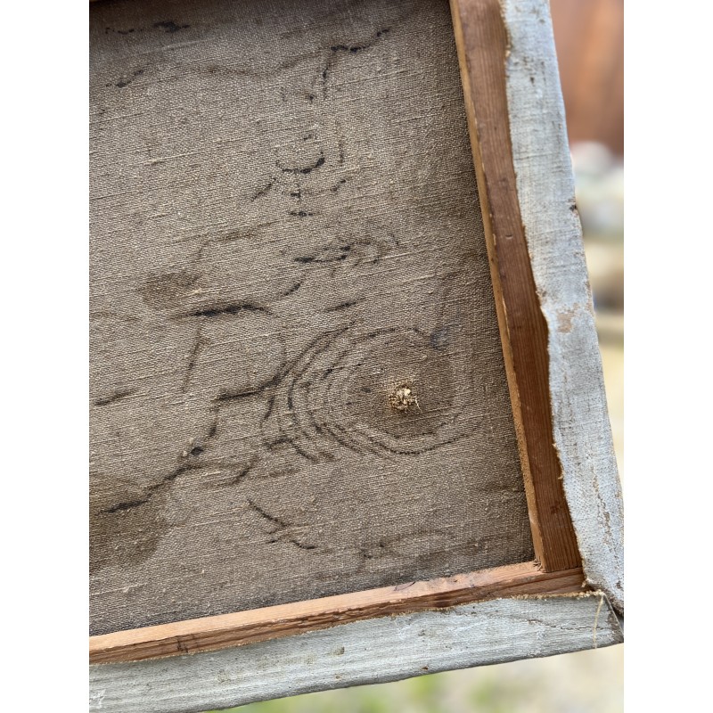 Quelques traces du temps et un petit trou visible au dos de la toile, sans incidence sur la lecture de l’œuvre (voir photos).