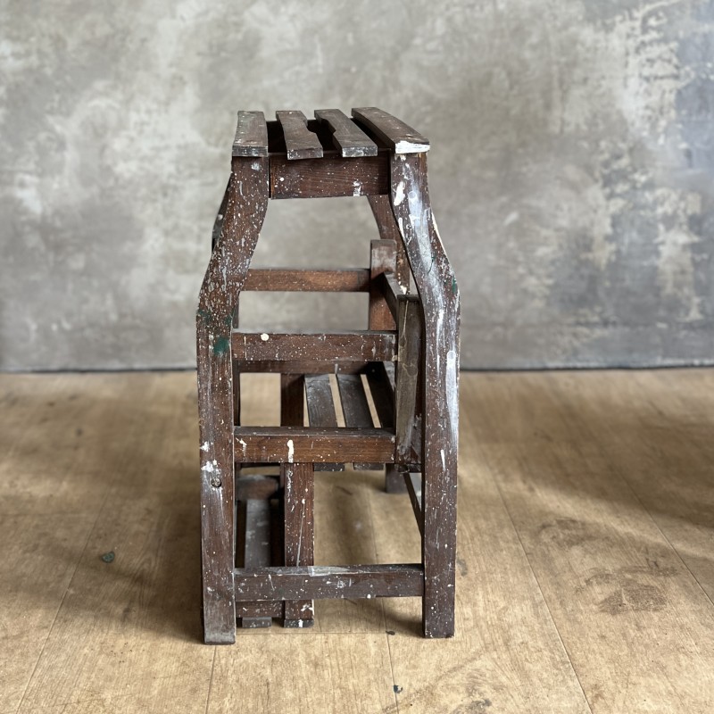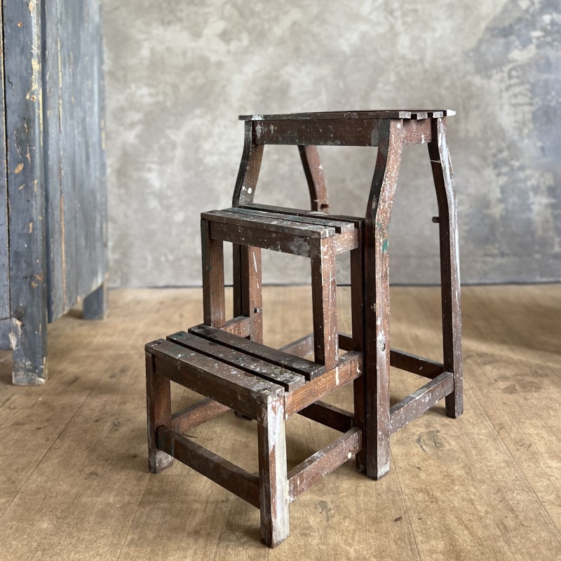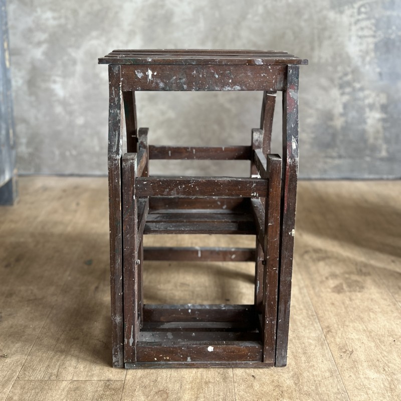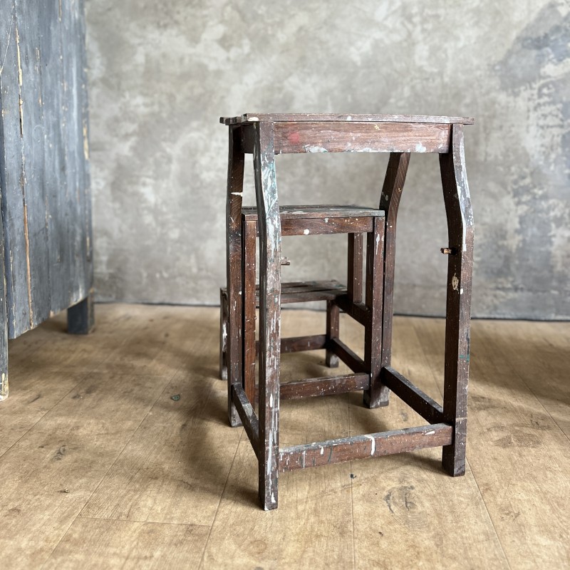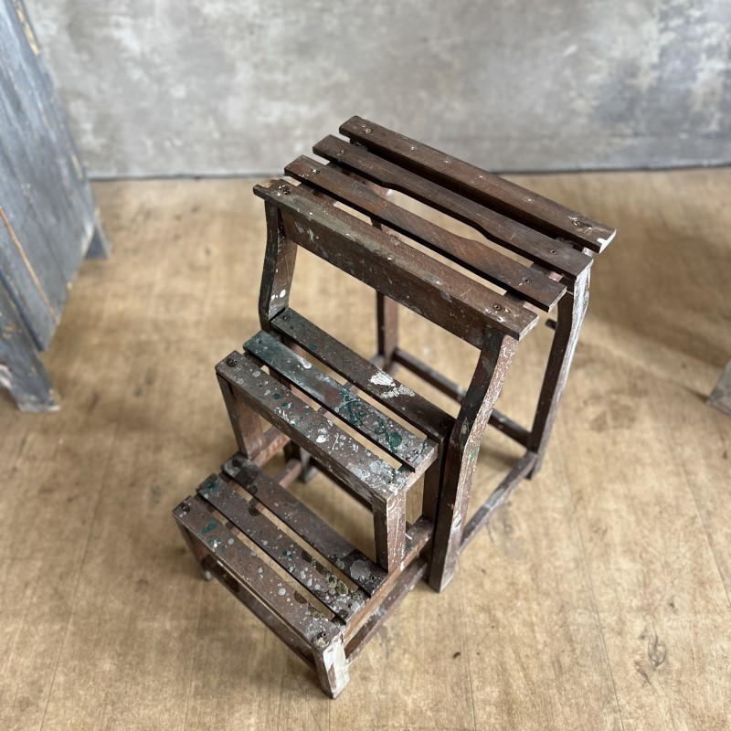 Petit escabeau ancien en bois, marqué par son usage et ses éclats de peinture d’atelier.