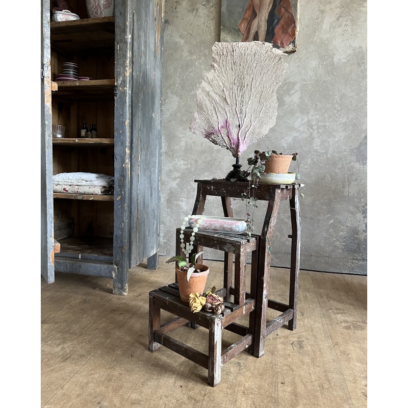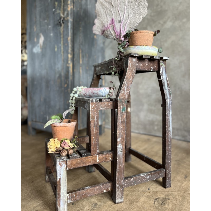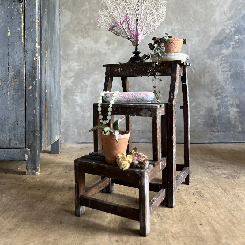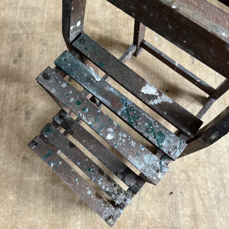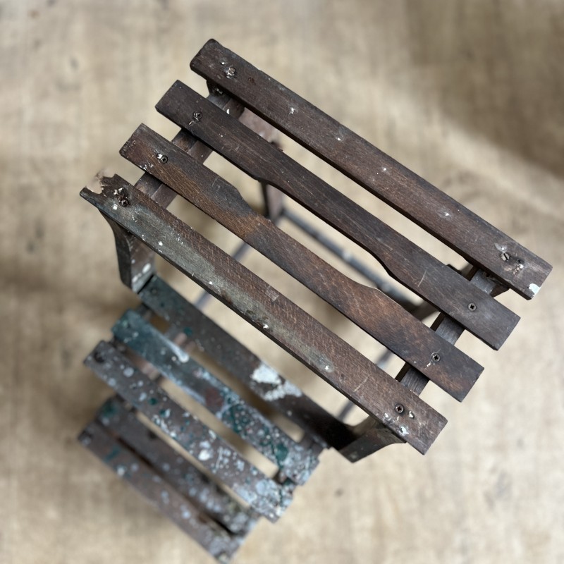 Petit escabeau ancien en bois, marqué par son usage et ses éclats de peinture d’atelier.