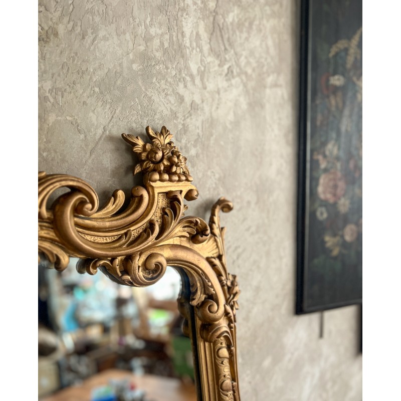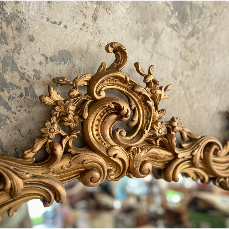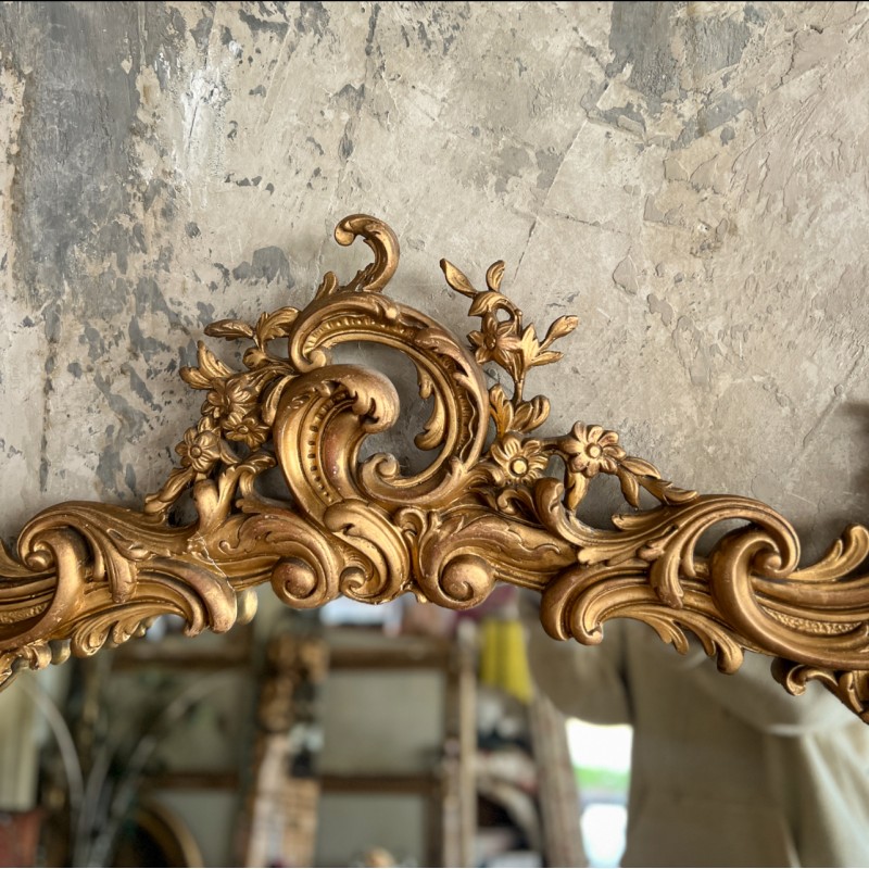 Spectaculaire miroir à fronton orné de volutes et feuillages dorés.