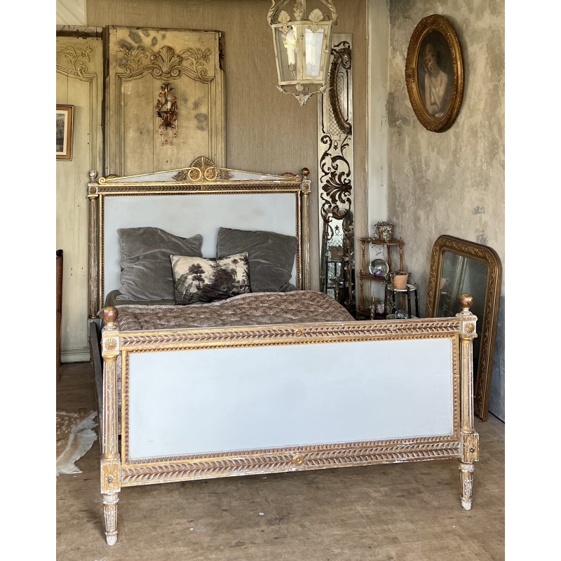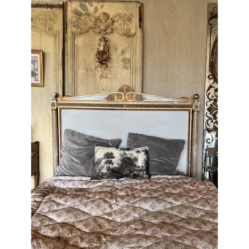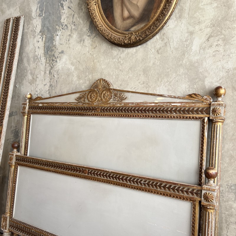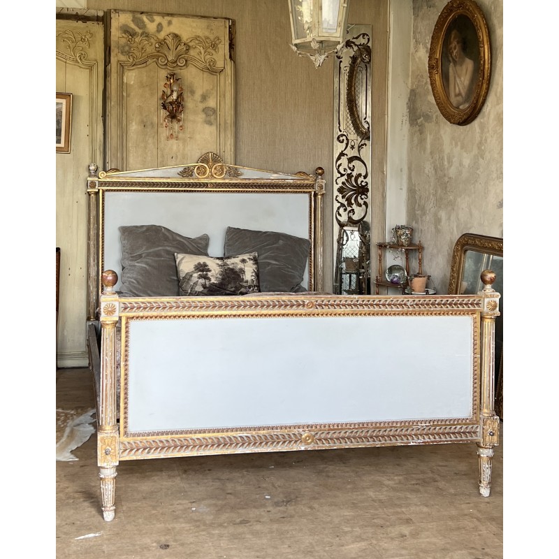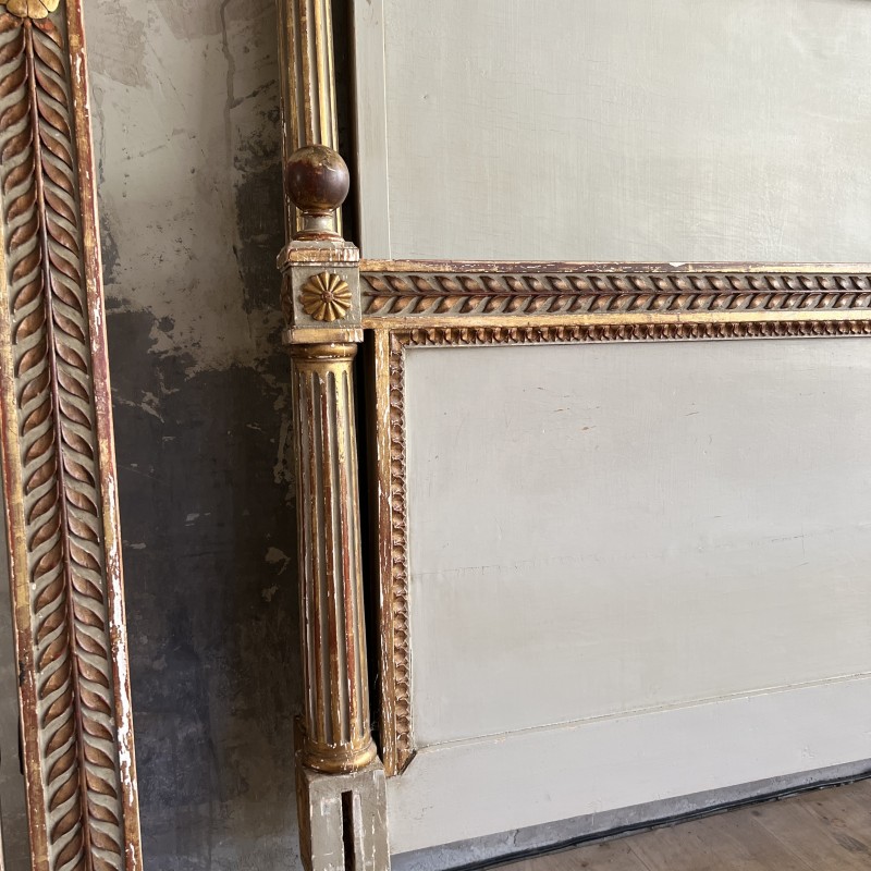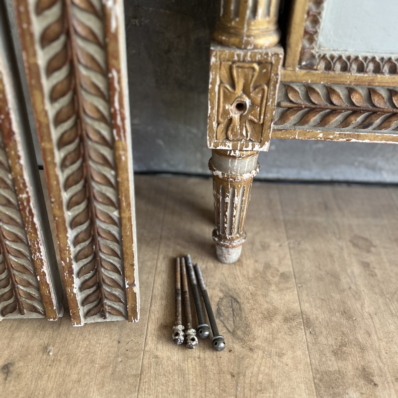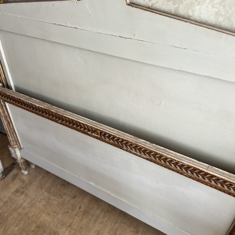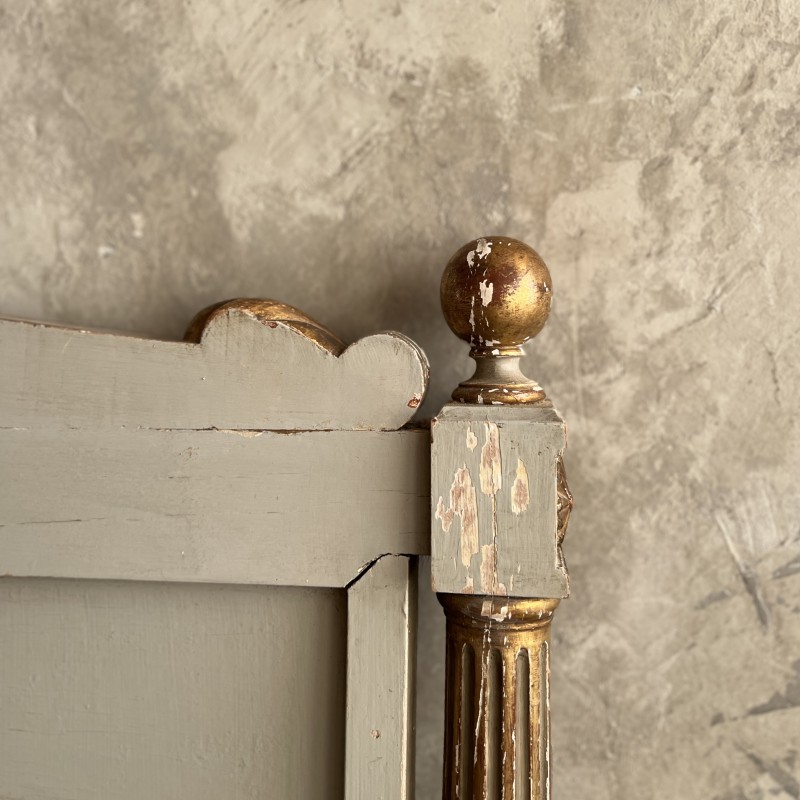 On y retrouve tout le vocabulaire décoratif de l’époque : feuillages, rosaces, rubans, cannelures, et un superbe fronton coquille. Structure stable, bois sain, et patine dans son jus.La peinture rechampie (gris très pâle) et la dorure présentent des éclats et traces du temps. Pour un lit 140x190