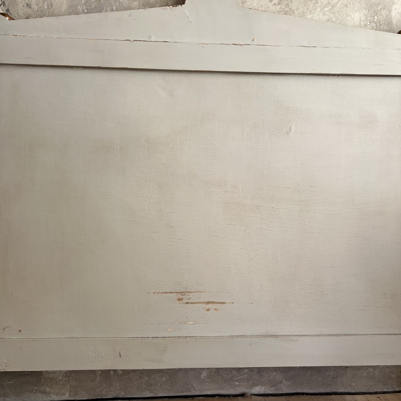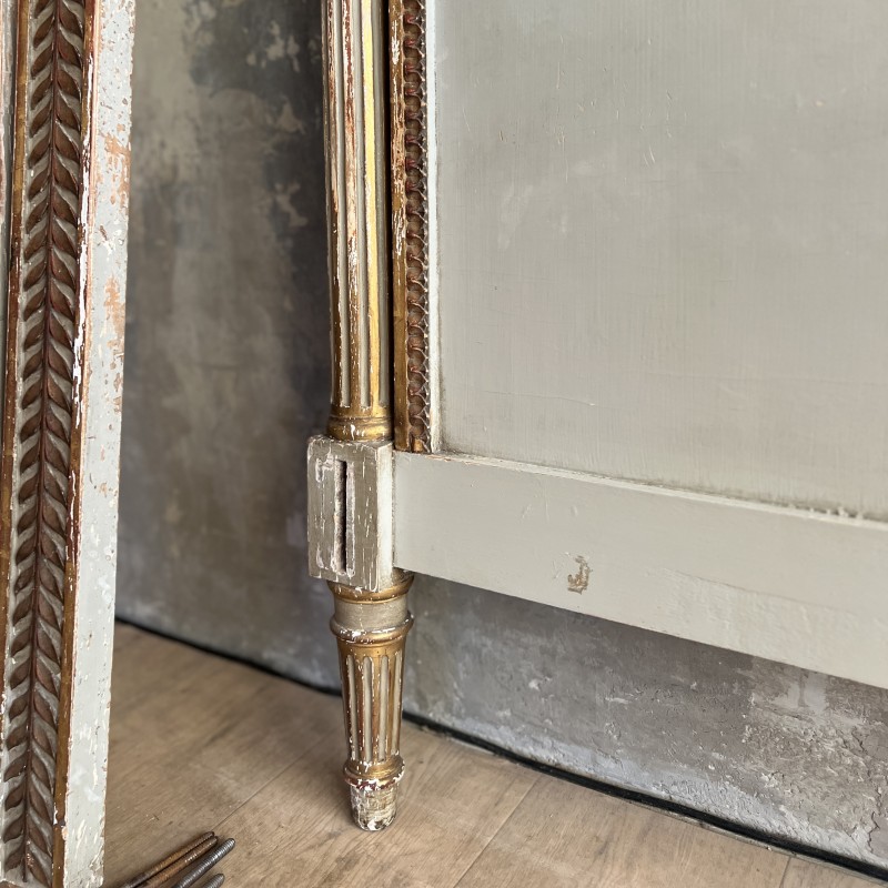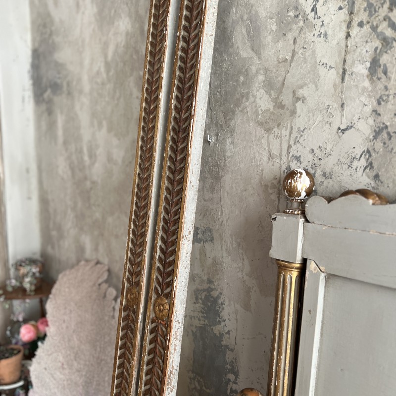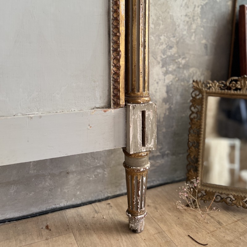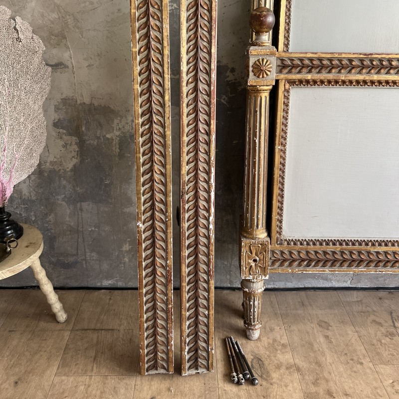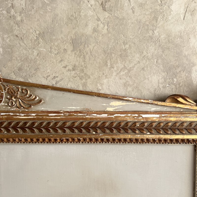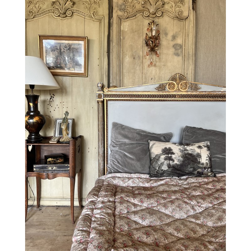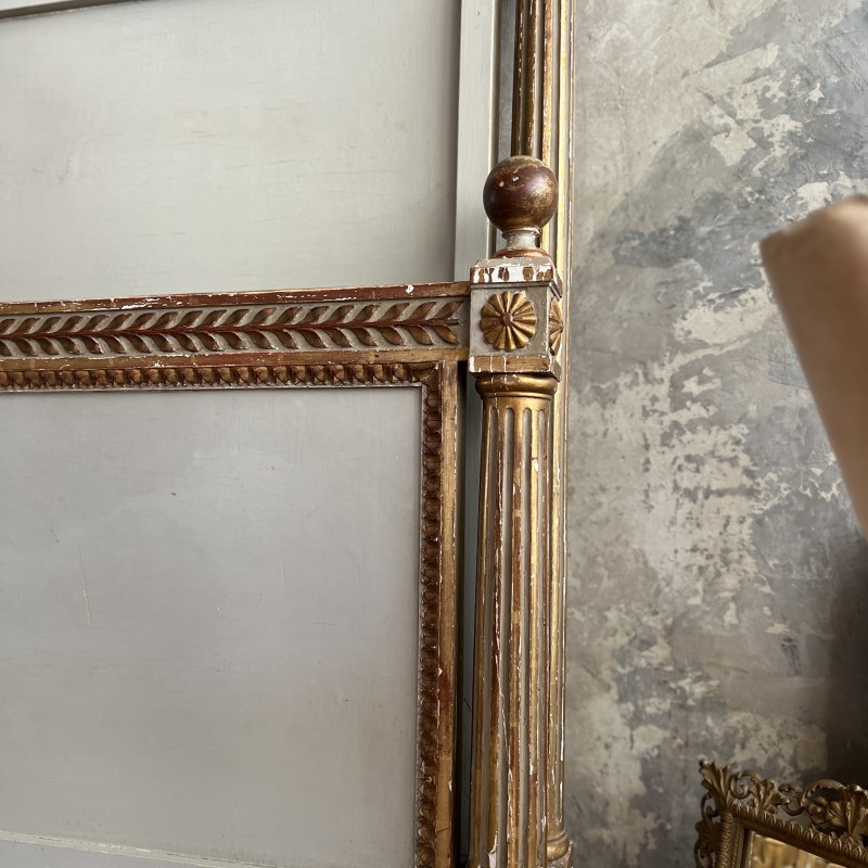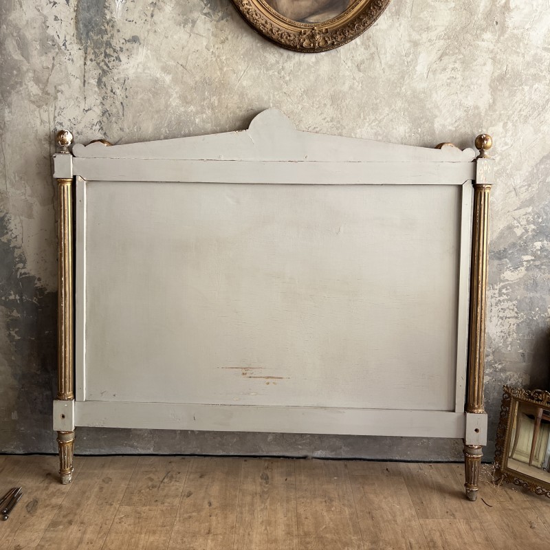 On y retrouve tout le vocabulaire décoratif de l’époque : feuillages, rosaces, rubans, cannelures, et un superbe fronton coquille. Structure stable, bois sain, et patine dans son jus.La peinture rechampie (gris très pâle) et la dorure présentent des éclats et traces du temps. Pour un lit 140x190
