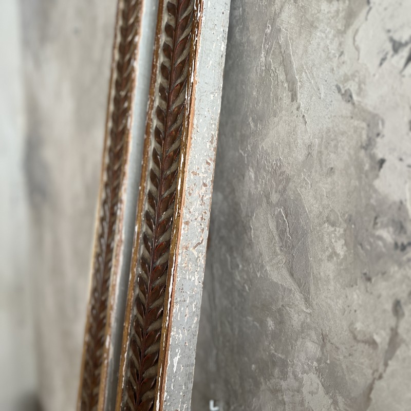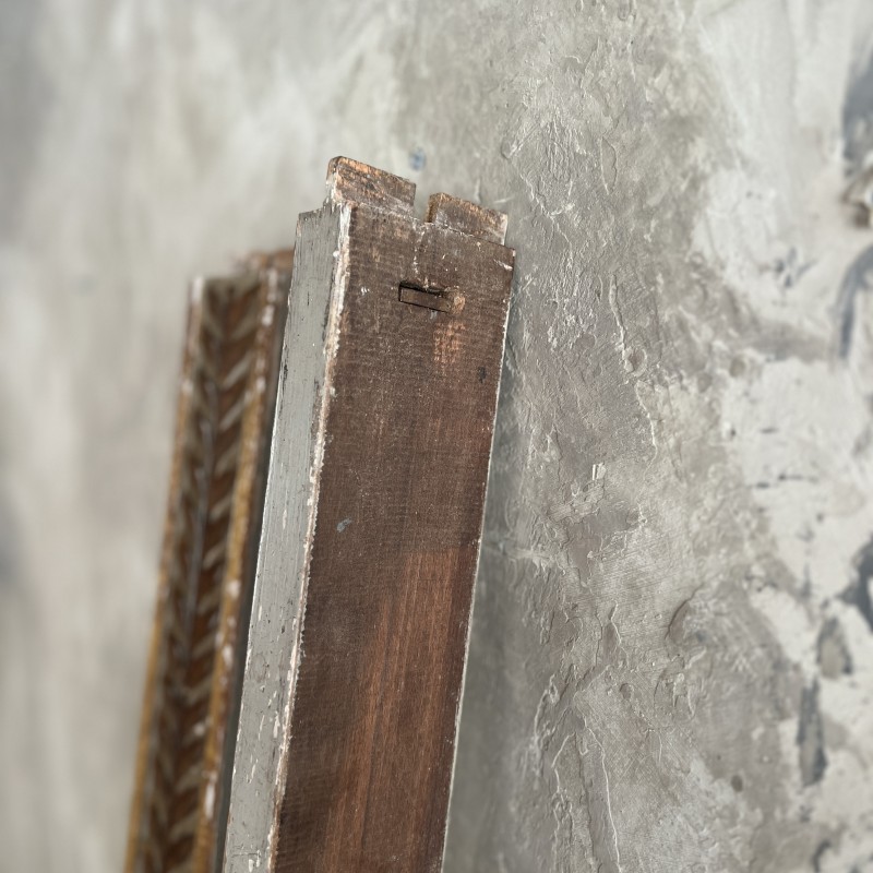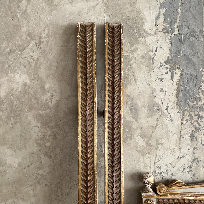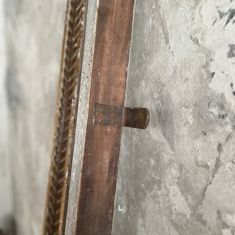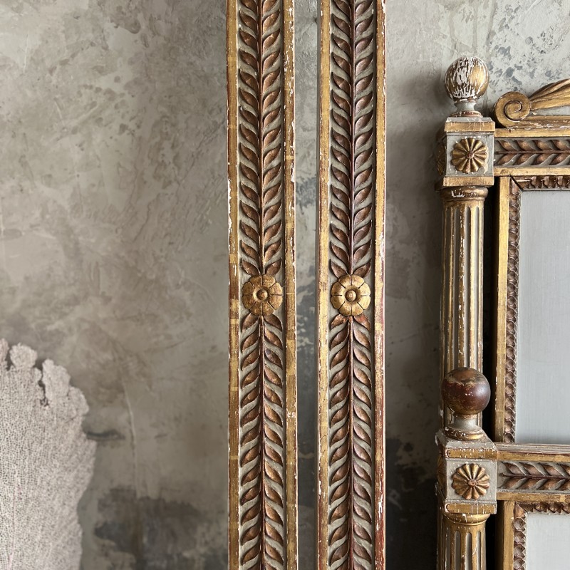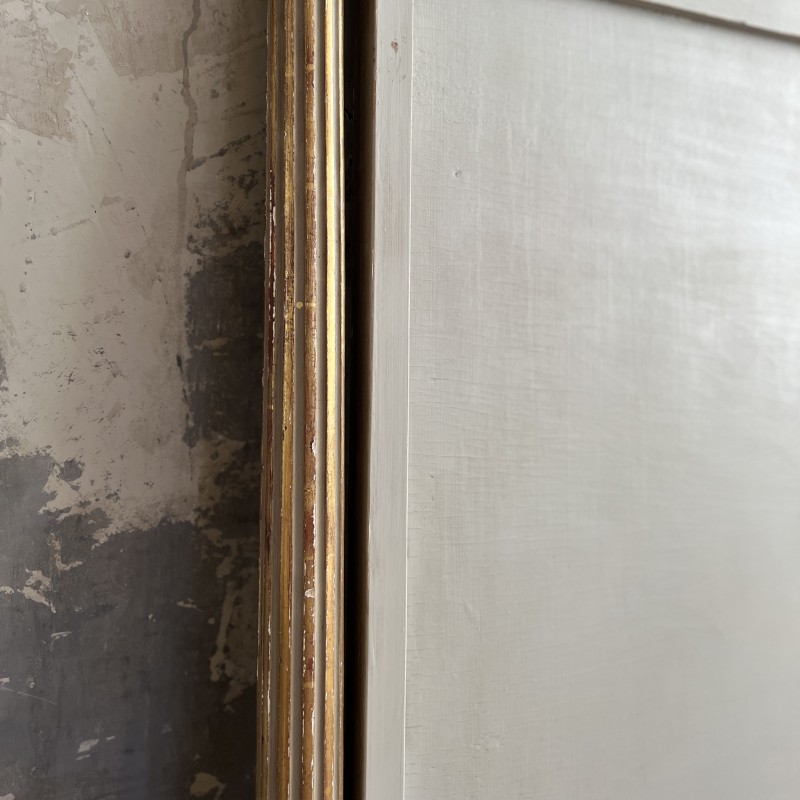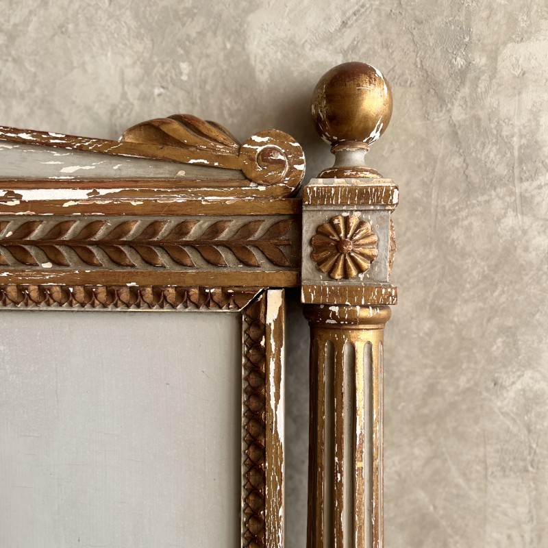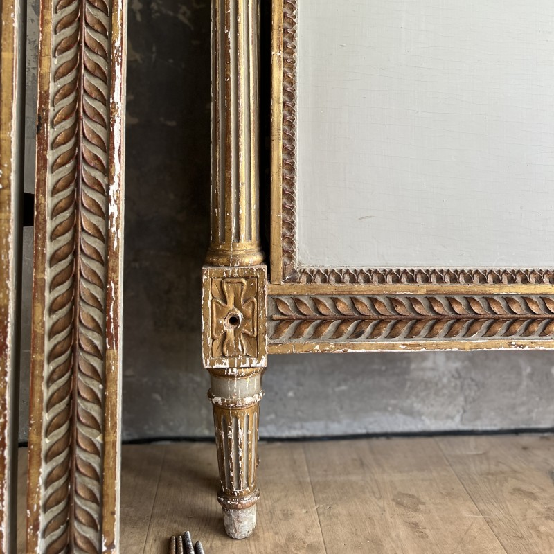 On y retrouve tout le vocabulaire décoratif de l’époque : feuillages, rosaces, rubans, cannelures, et un superbe fronton coquille. Structure stable, bois sain, et patine dans son jus.La peinture rechampie (gris très pâle) et la dorure présentent des éclats et traces du temps. Pour un lit 140x190