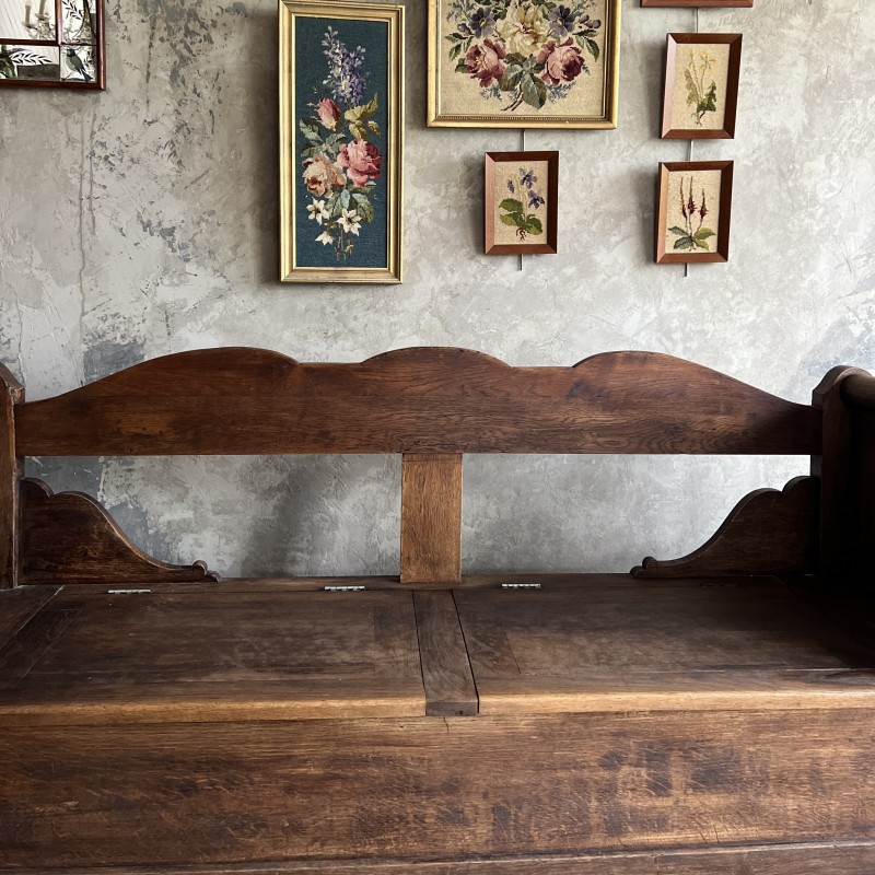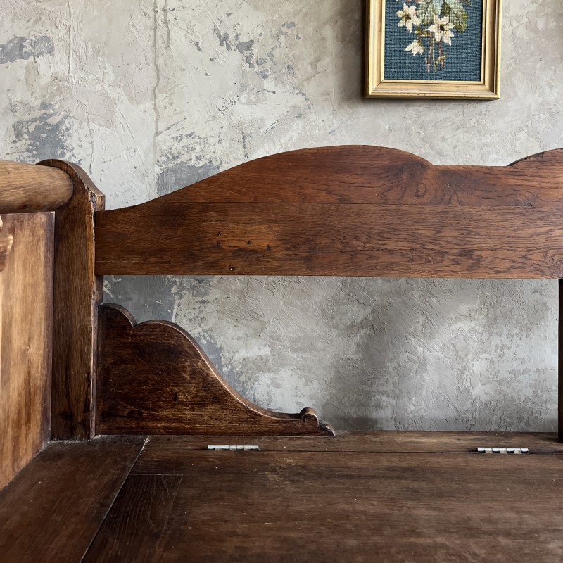 Travail ancien, stable et solide, avec de jolis détails sculptés sur les montants et un dossier découpé.