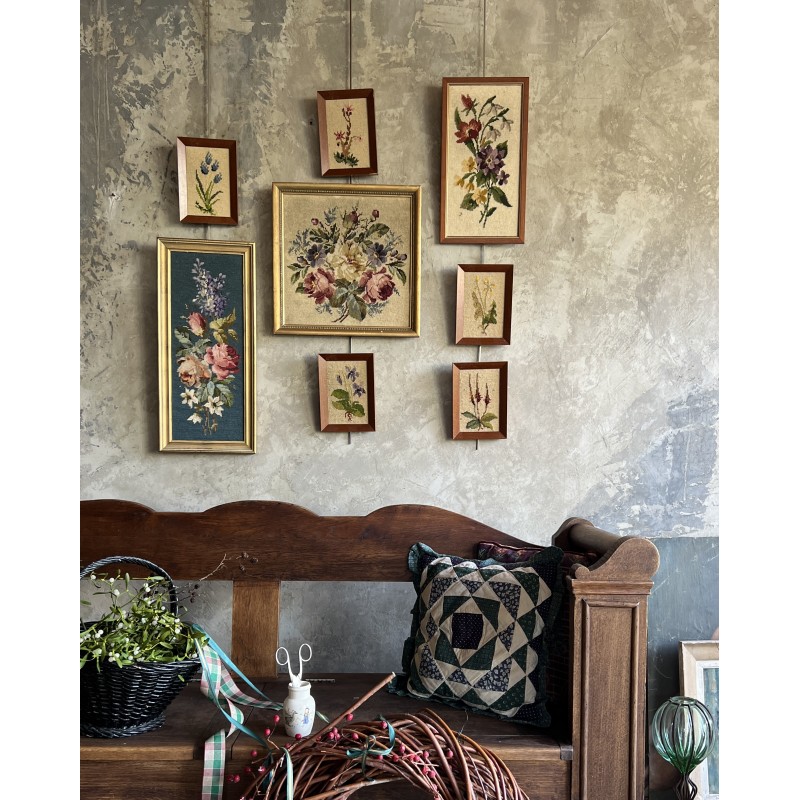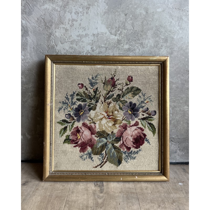 Canevas ancien représentant un bouquet floral, aux teintes douces et légèrement fanées qui lui donnent tout son charme.