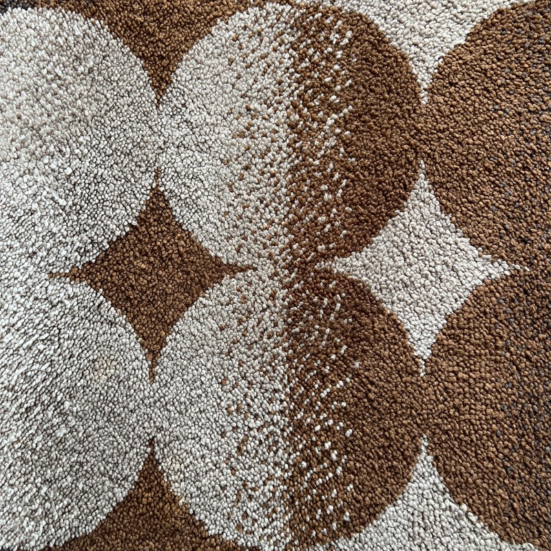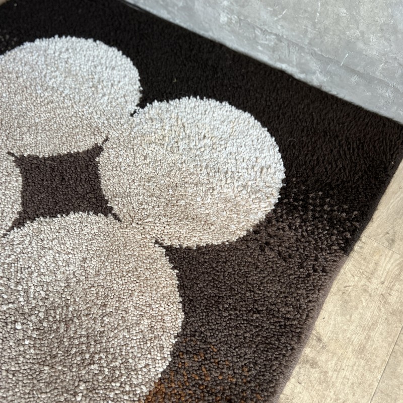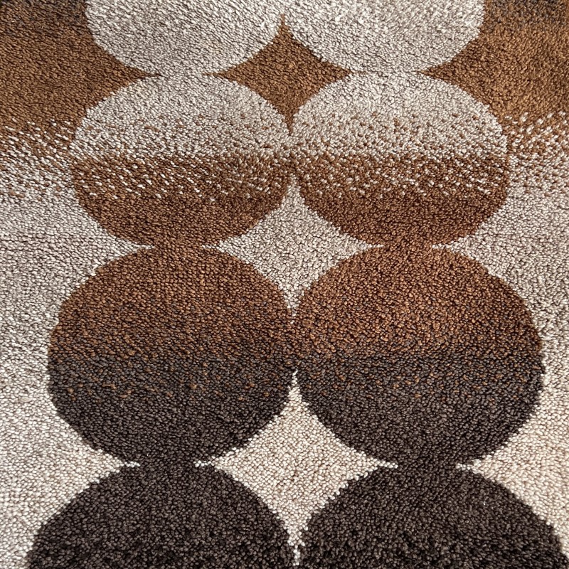 Tapis vintage au motif géométrique, composé de cercles dégradés dans des tons bruns, chocolat et écru.Son graphisme seventies apporte immédiatement du caractère à une pièce, tout en restant chaleureux et facile à associer. La laine est dense et moelleuse. Un tapis qui structure l’espace sans l’alourdir, idéal dans un salon, une chambre ou un bureau.