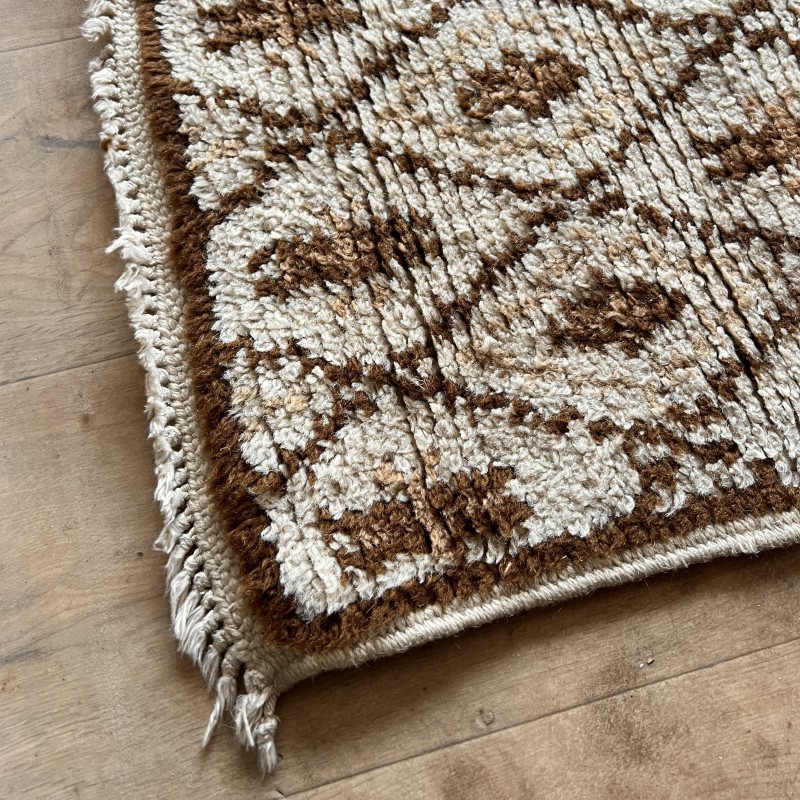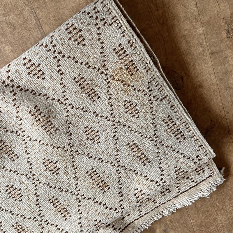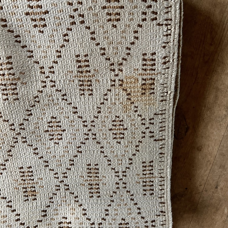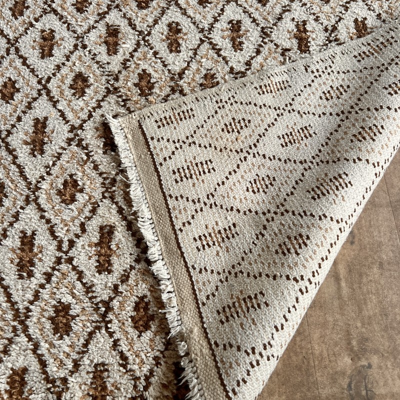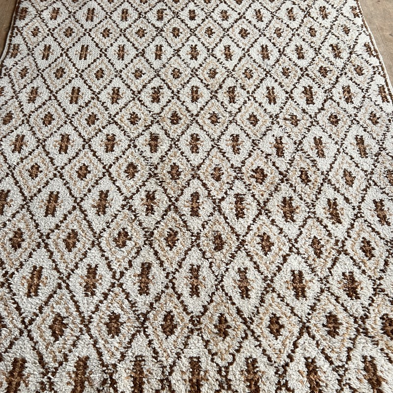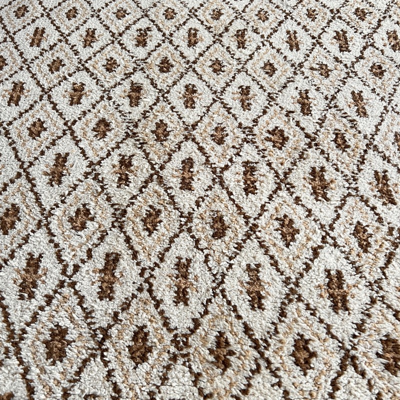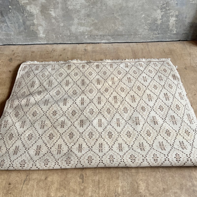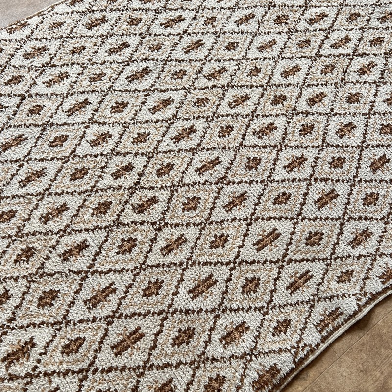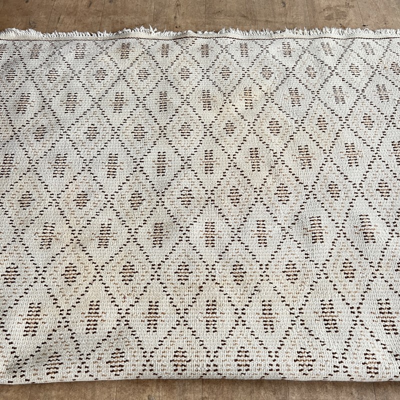 Tapis vintage à motif de losanges répétés, dans une palette écru et brun.