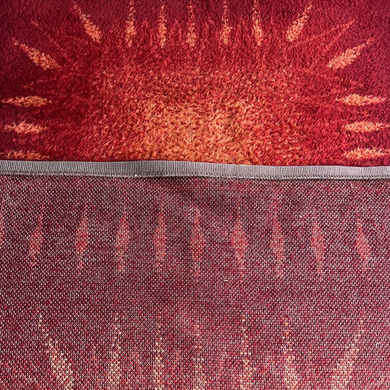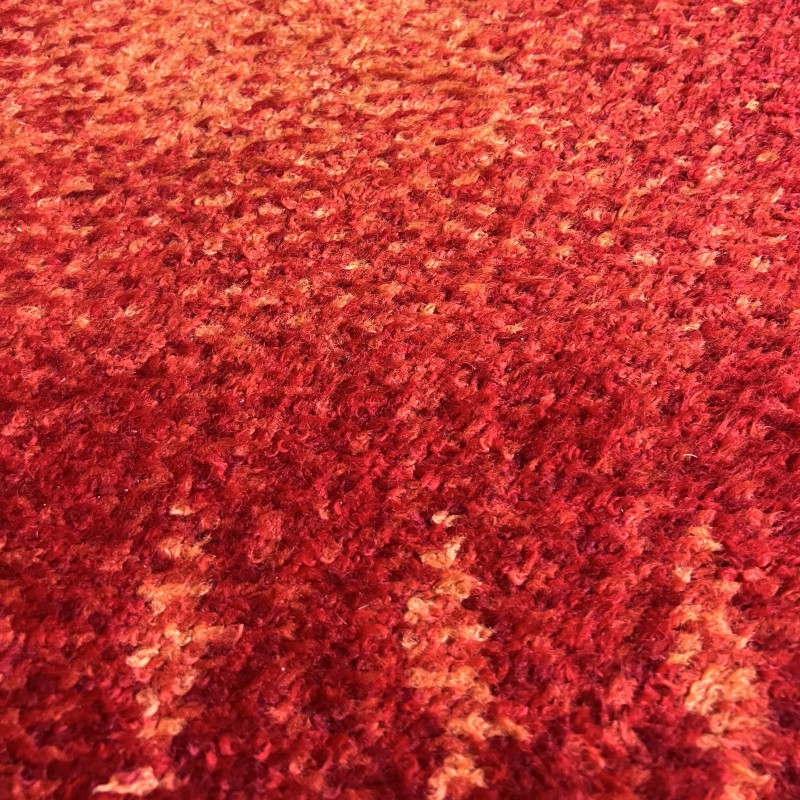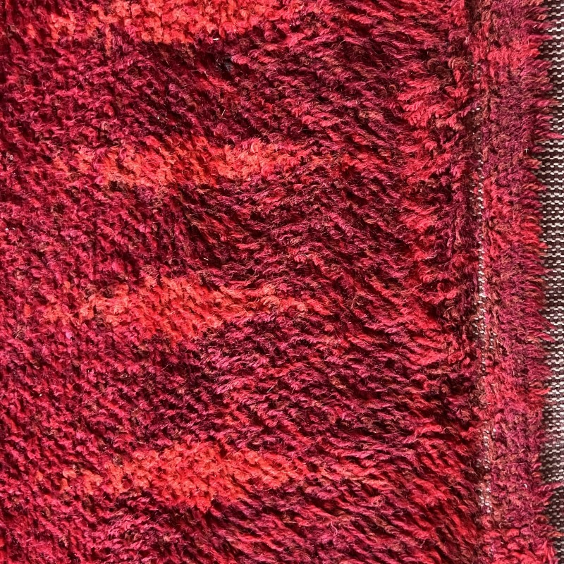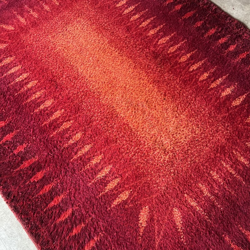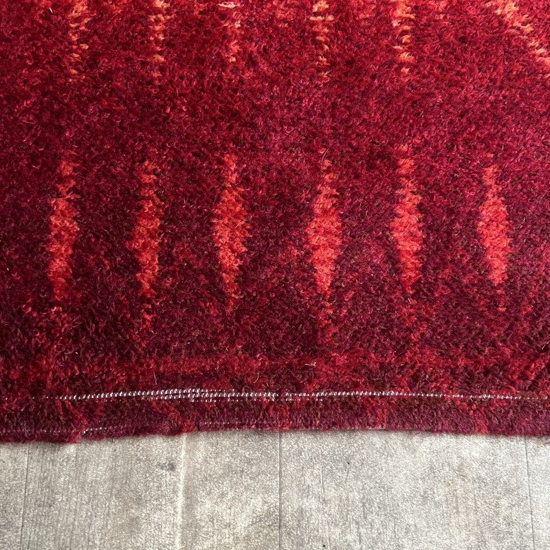 Tapis vintage signé Desso, dans une version plus petite du célèbre modèle au dégradé rouge et orangé.Ce tapis présente une usure visible sur les extrémités, avec une laine légèrement frottée laissant apparaître la trame par endroits. Une patine liée à l’usage, qui n’enlève rien à la qualité de la pièce mais lui donne un caractère plus brut et authentique.