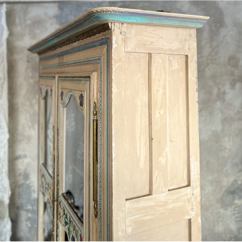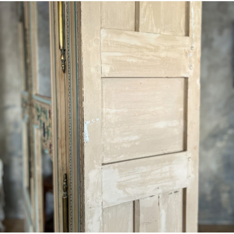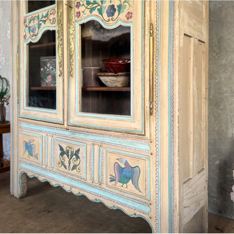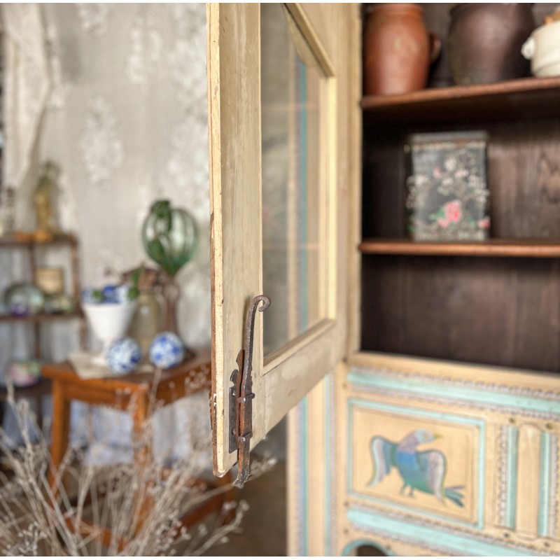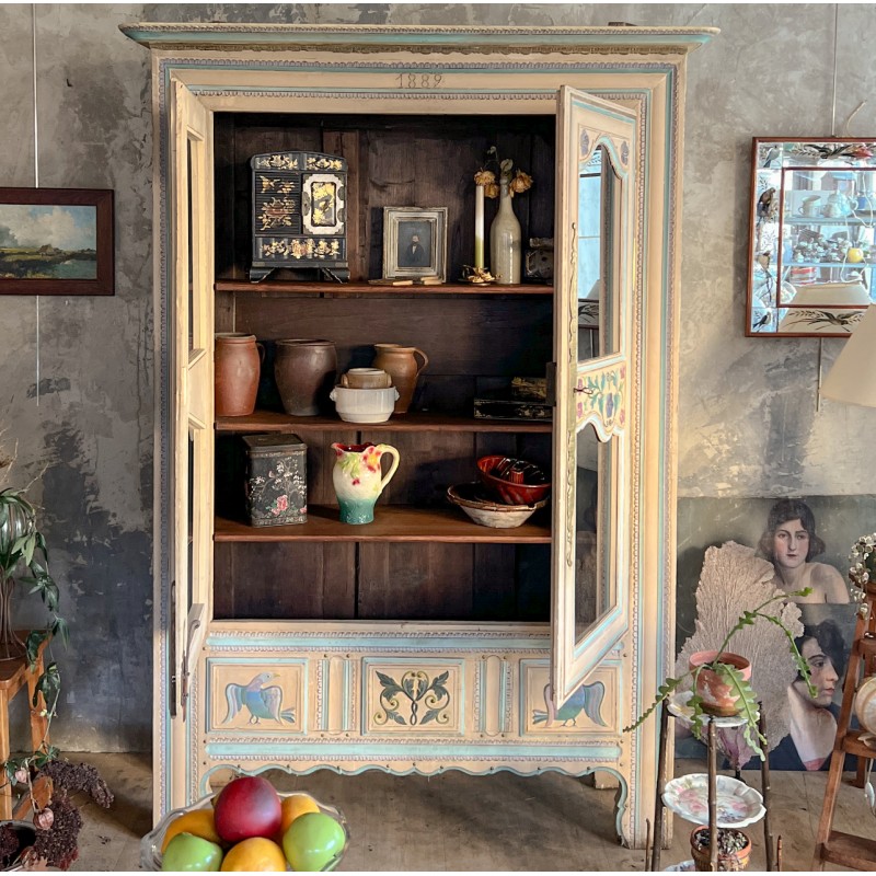 Magnifique armoire ancienne en bois, entièrement peinte à la main et datée “1889”. Une pièce rare au charme fou, avec une polychromie douce et pas telle, un décor floral délicat et de jolis motifs d’oiseaux en partie basse.