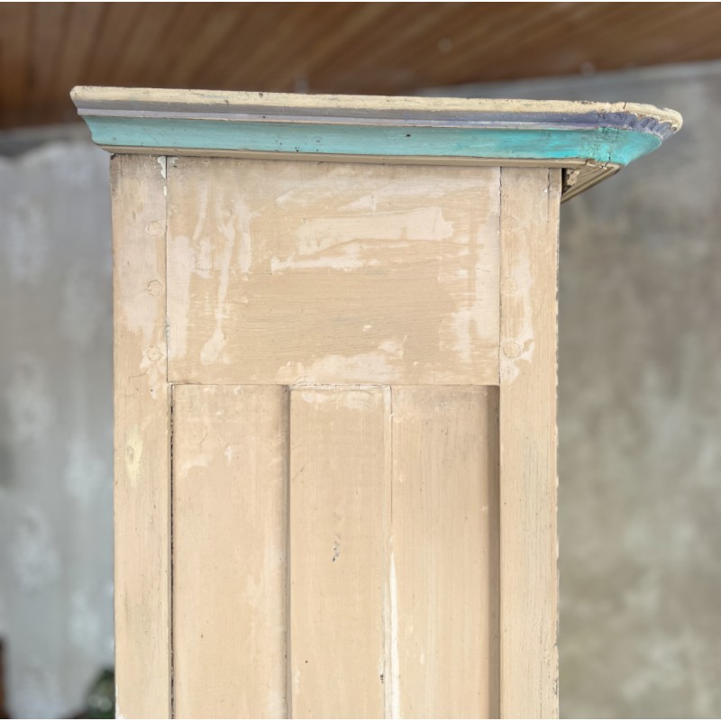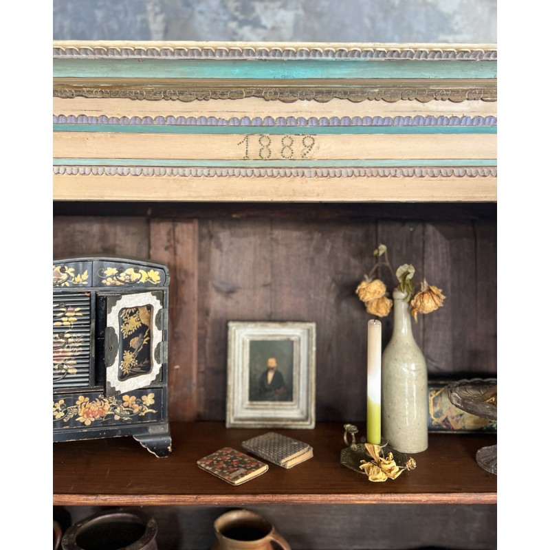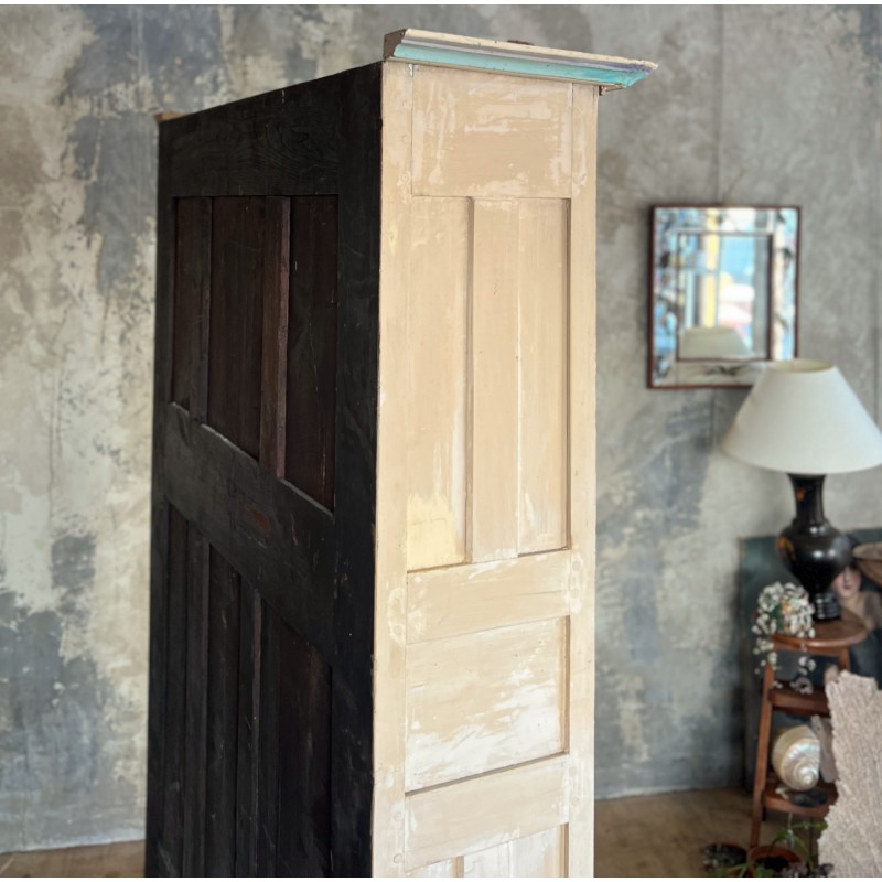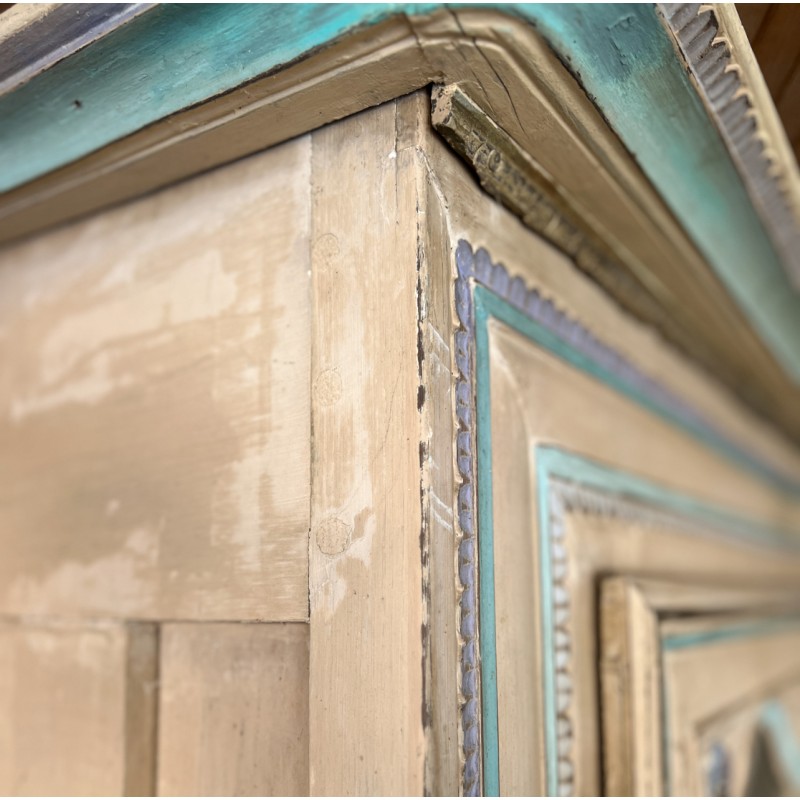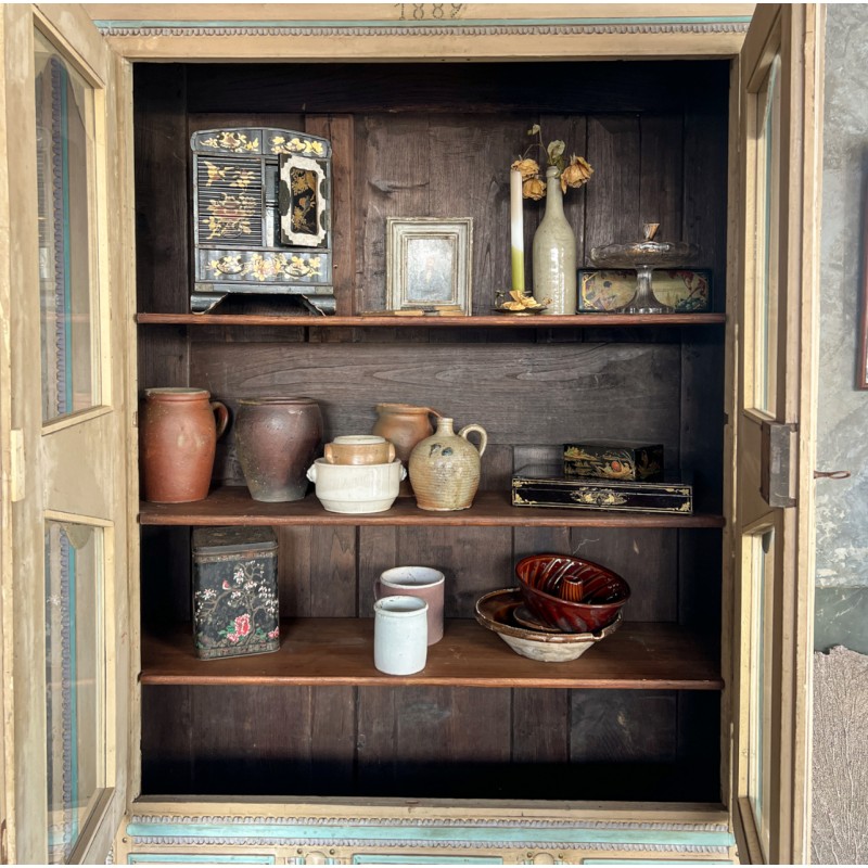 Magnifique armoire ancienne en bois, entièrement peinte à la main et datée “1889”. Une pièce rare au charme fou, avec une polychromie douce et pas telle, un décor floral délicat et de jolis motifs d’oiseaux en partie basse.