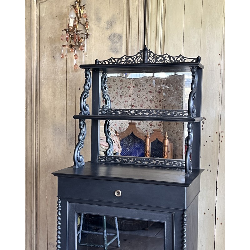 Cabinet ancien en bois, composé d’une partie basse fermée par une porte vitrée et d’une partie haute ouverte avec étagères et fond miroir (traces d’usures)