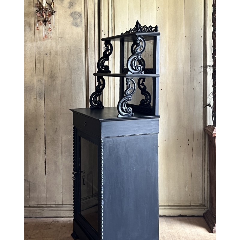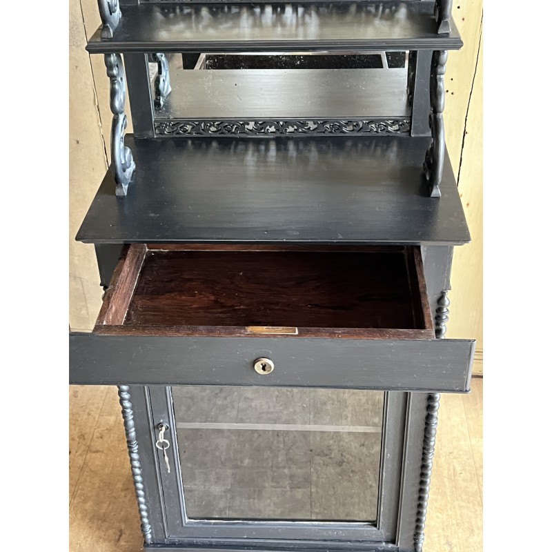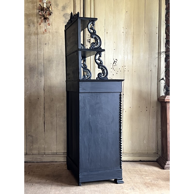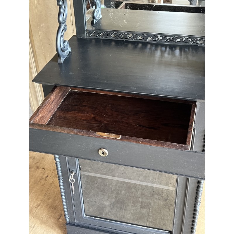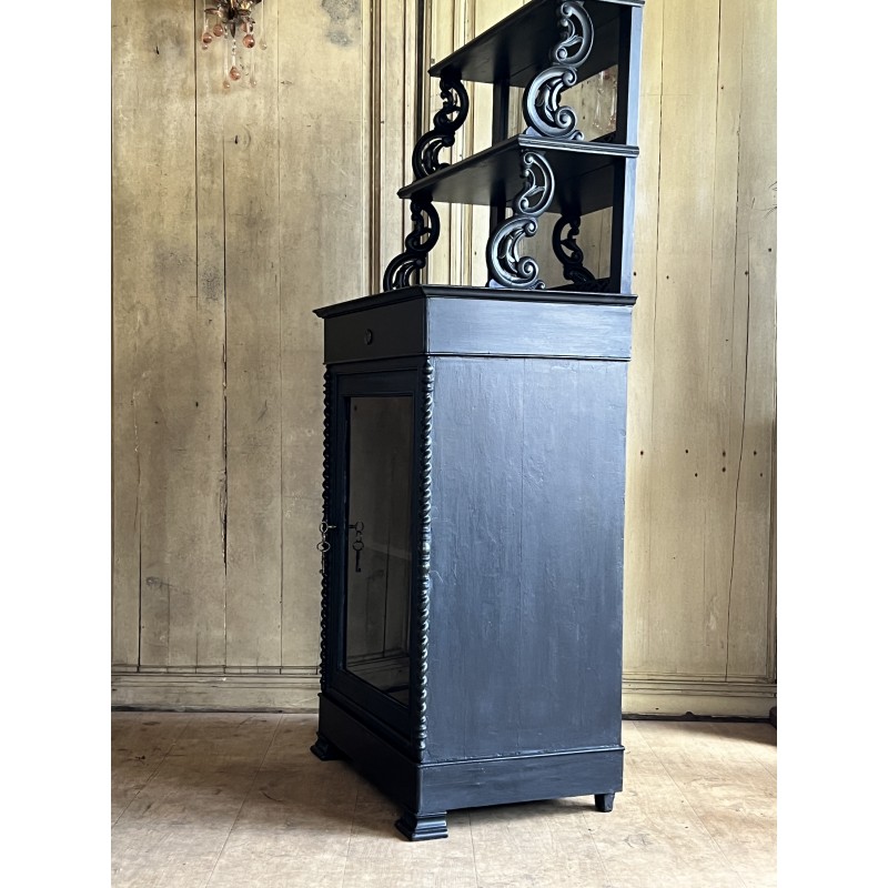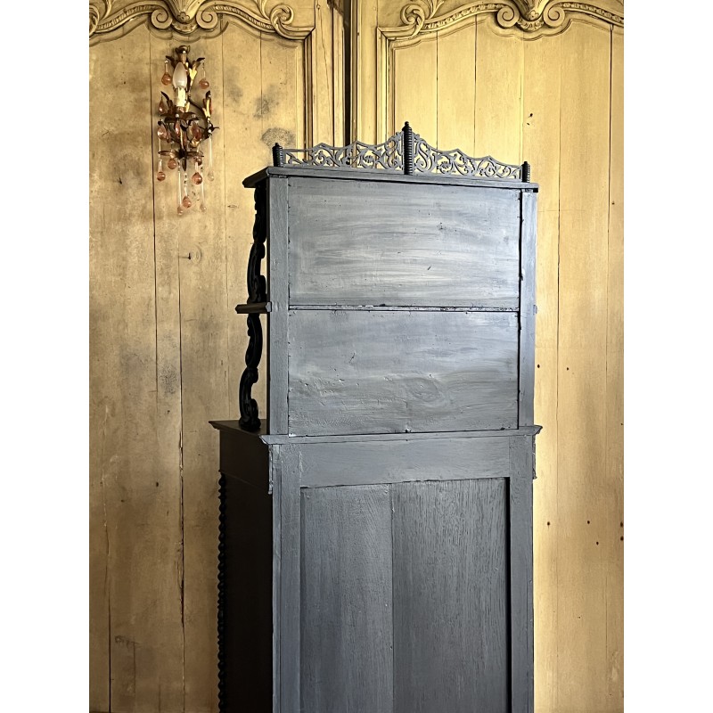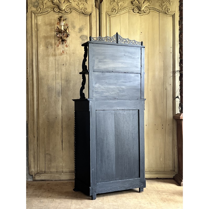 Le meuble présente une structure droite avec des montants tournés sur la partie basse et des éléments sculptés décoratifs sur la partie haute.