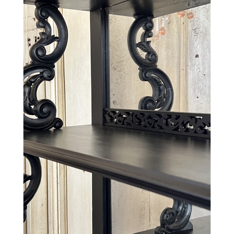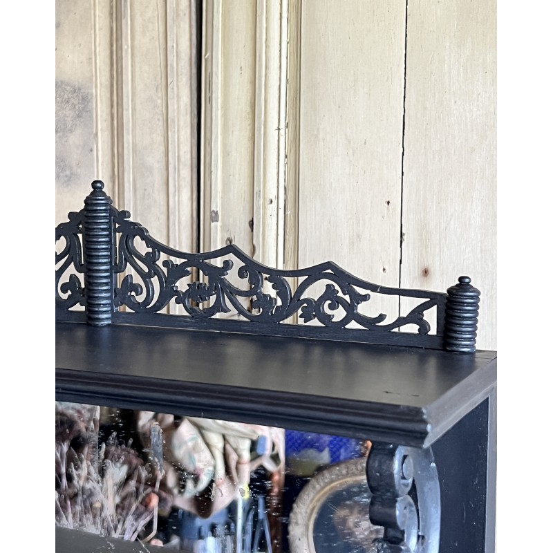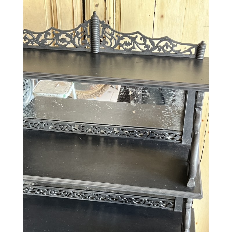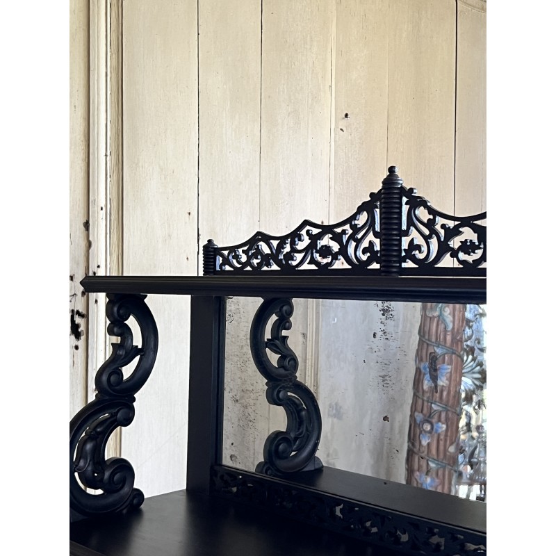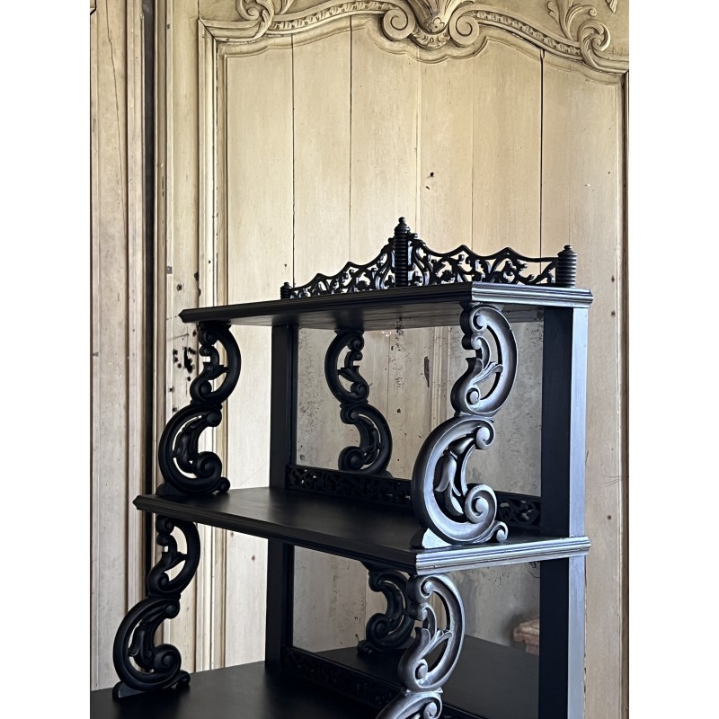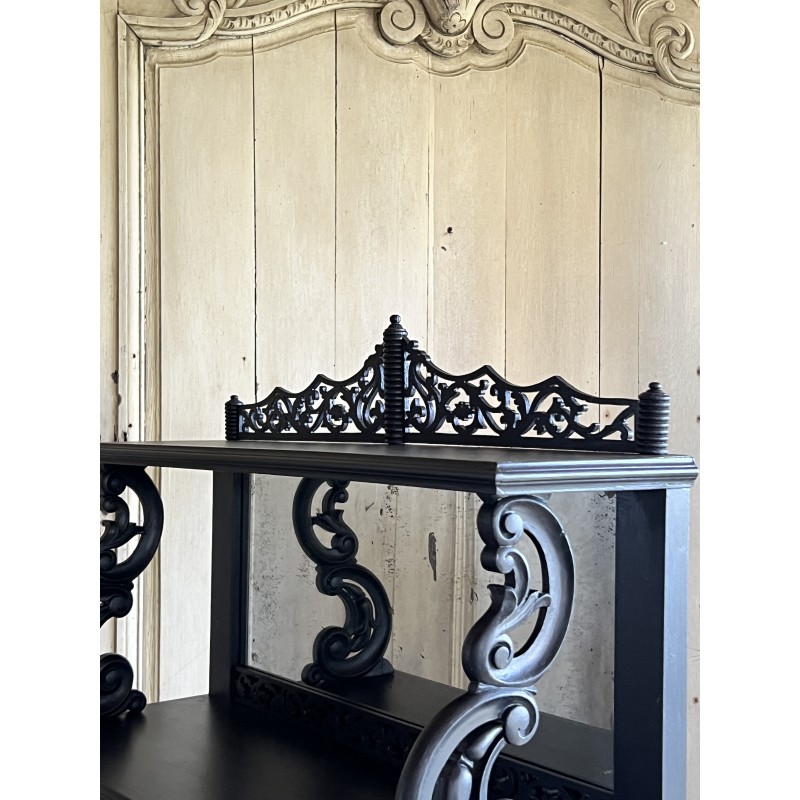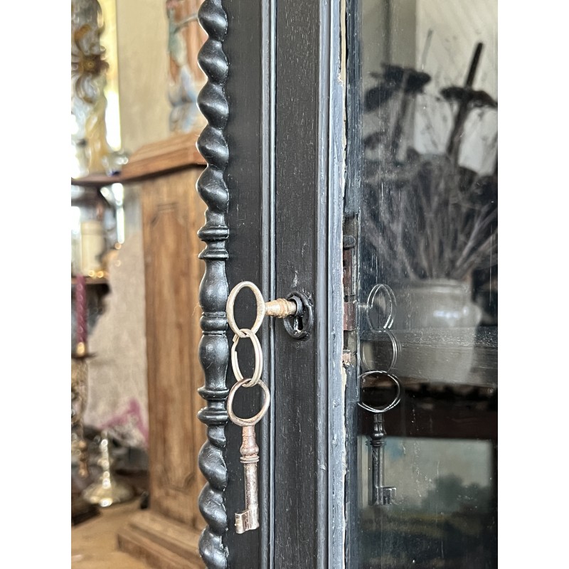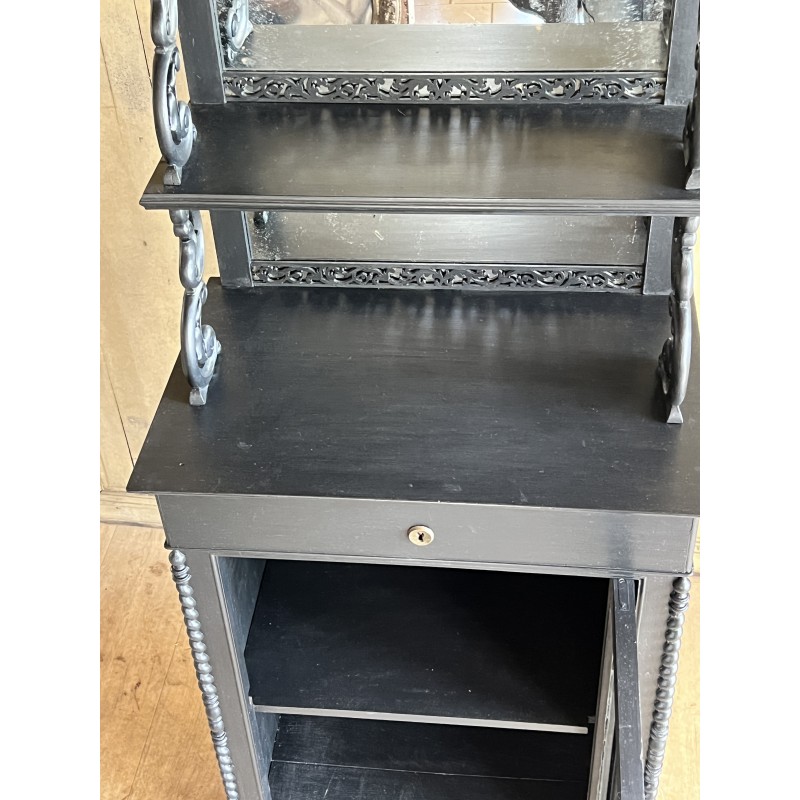 Le meuble présente une structure droite avec des montants tournés sur la partie basse et des éléments sculptés décoratifs sur la partie haute.