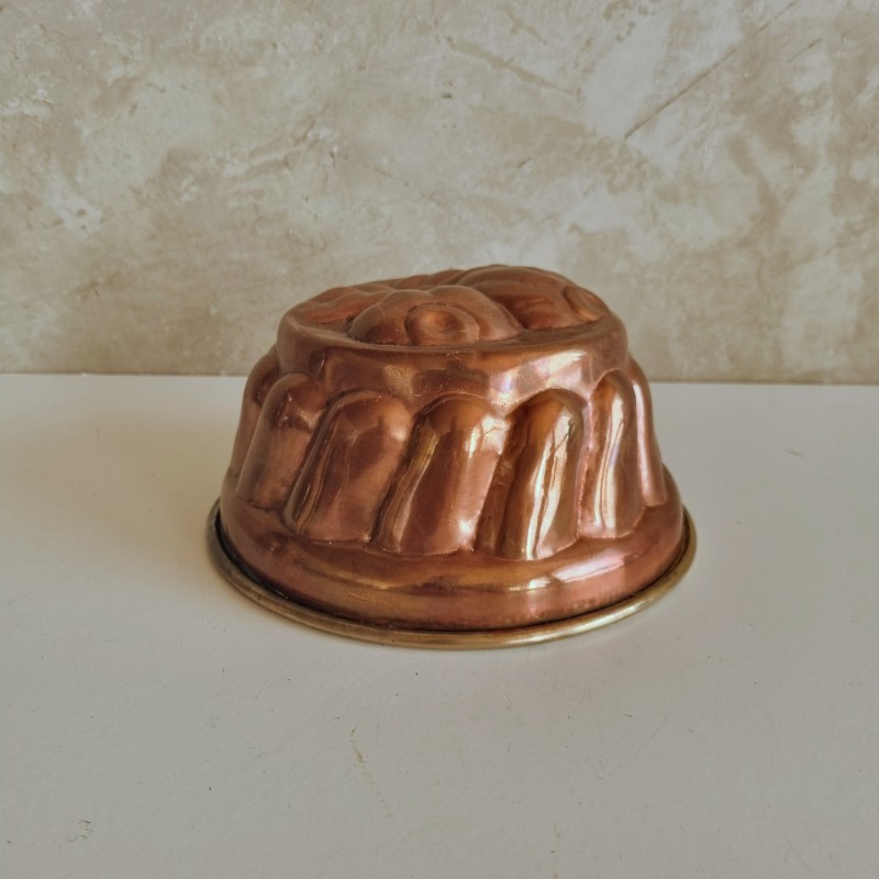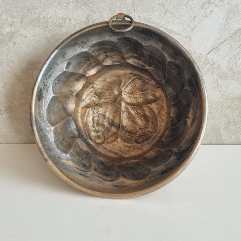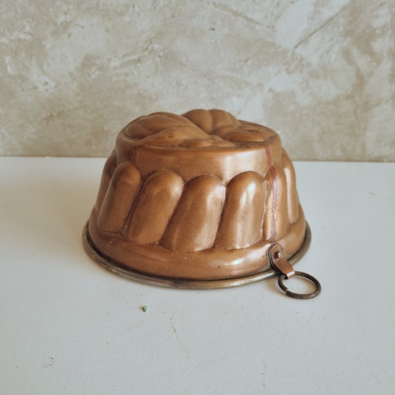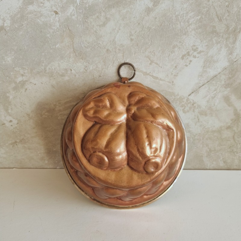 Moule à gâteau en cuivre, décoré de fruits.