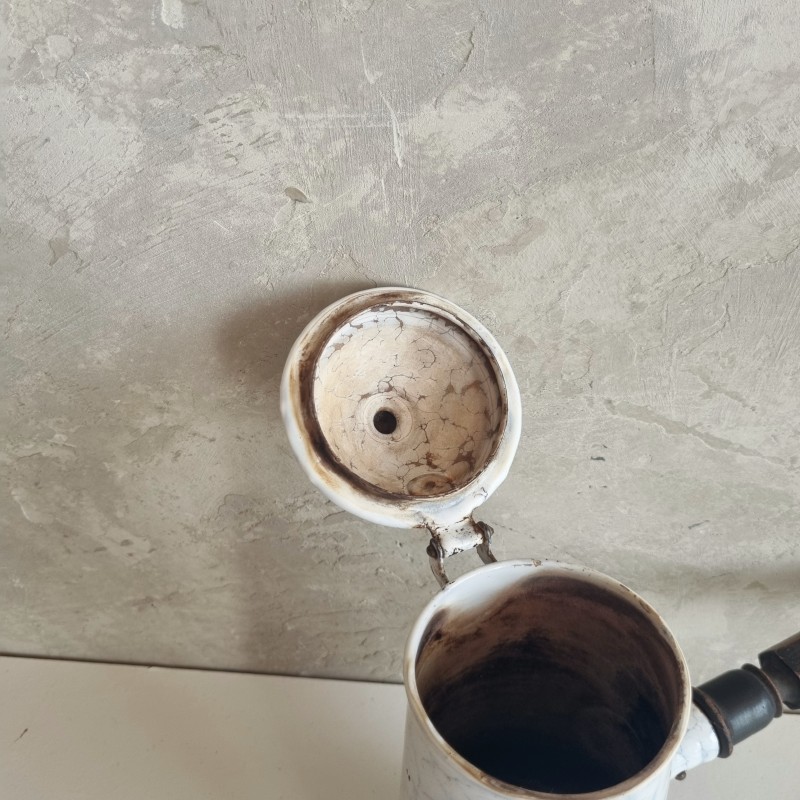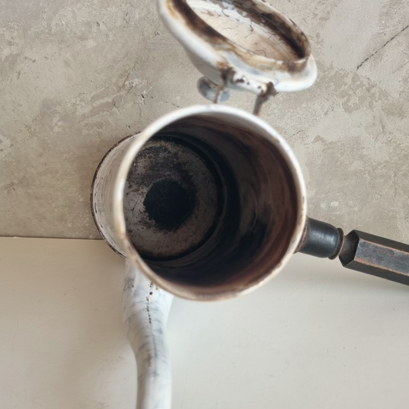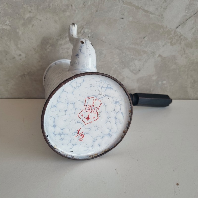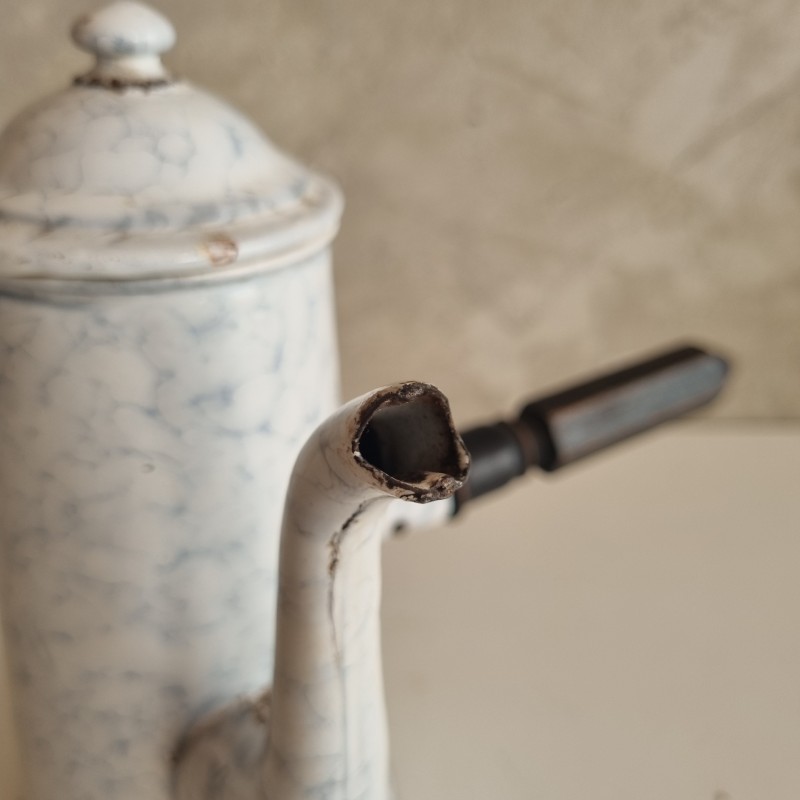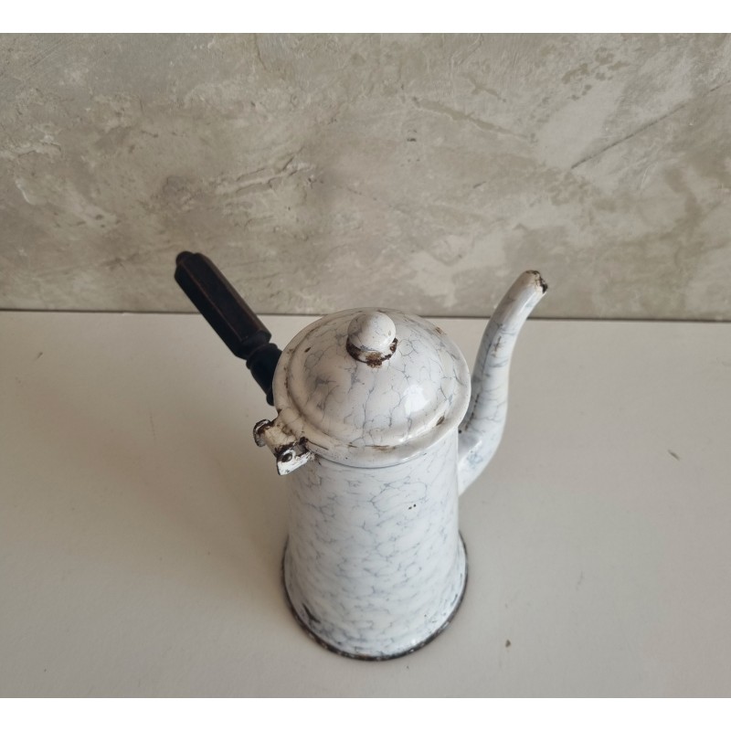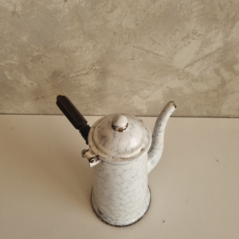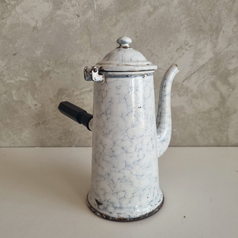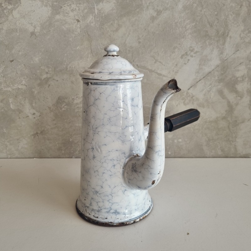 Chocolatière en tôle émaillée blanche à décor marbré.