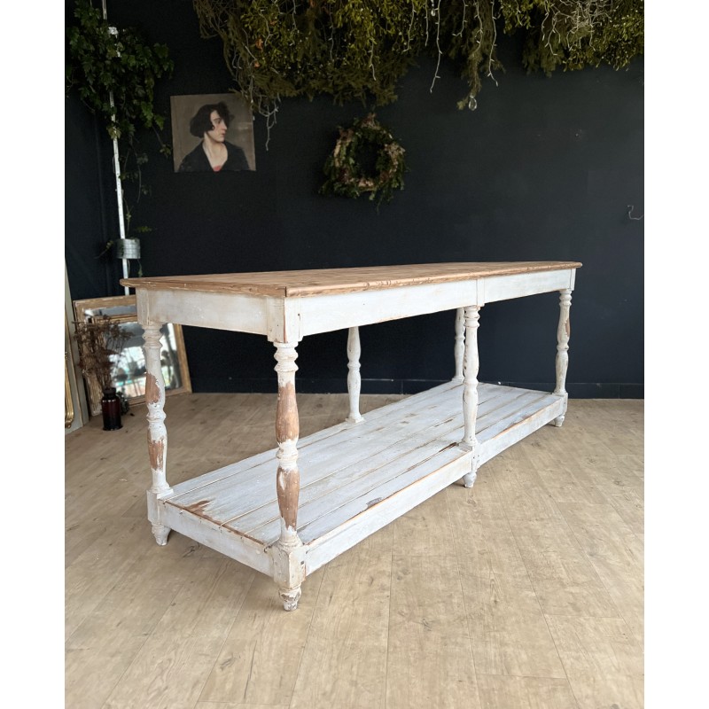 Table de drapier ancienne, elle est patinée, elle est en bon état général. Le piètement est de couleur blanc cassé, la peinture est frottée par endroit (voir photo) Le plateau a été poncé et ciré. Elle date du début du xxeme siècle. Pas de xylophages. Hauteur du plateau du dessous 18cm.