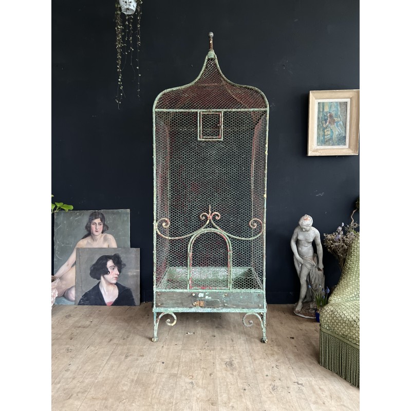 la structure est patinée, et laisse apparaître les différentes couches de peintures. Au fond de la cage un bac en zinc est installé, présence de deux petits trous.